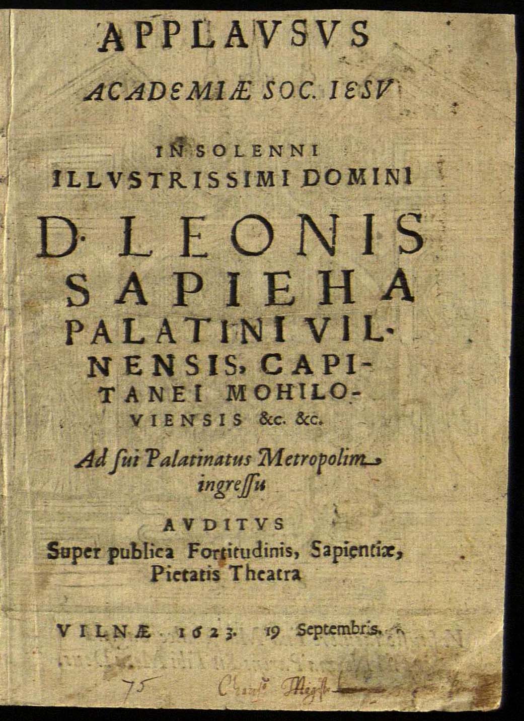 Įrišas knygos [Applausus Academiae Soc. Iesu in solenni illustrissimi domini d. Leonis Sapieha, [...]. [Vilnae : typis Academicis S.I., 1623].]