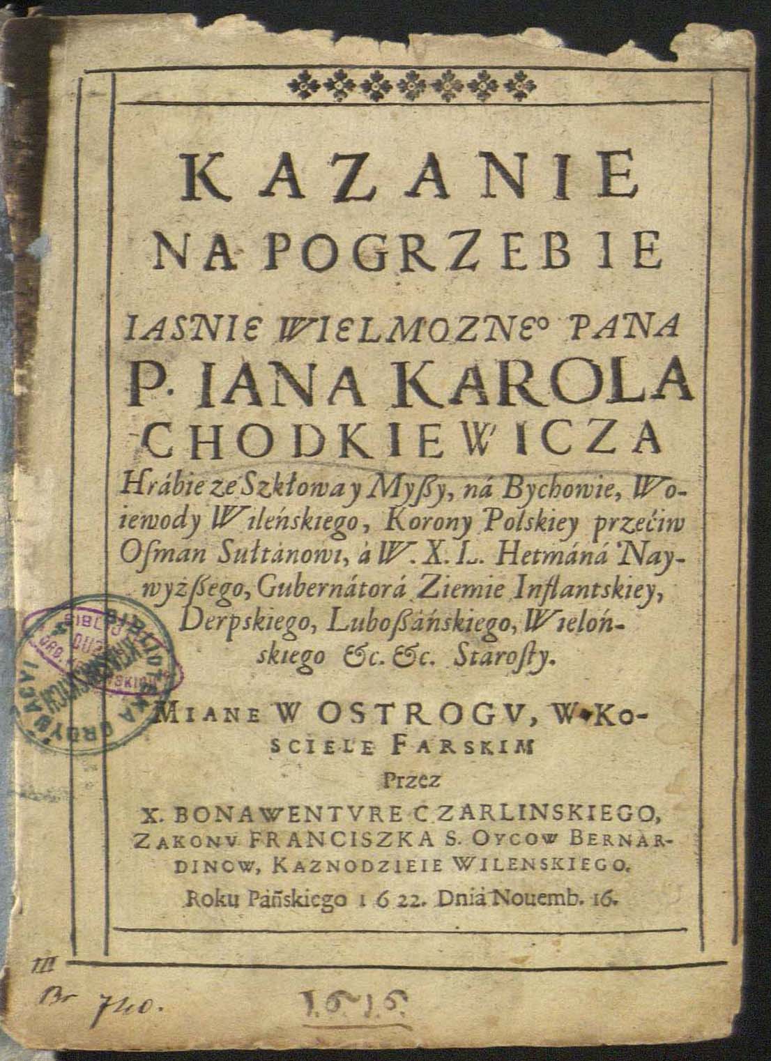 Įrišas knygos [Czarliński, Bonawentura. Kazanie na pogrzebie ... Jana Karola Chodkiewicza, ... woiewody Wileńskiego, [...]. [Wilno : druk. Acad. S.I., 1622].]