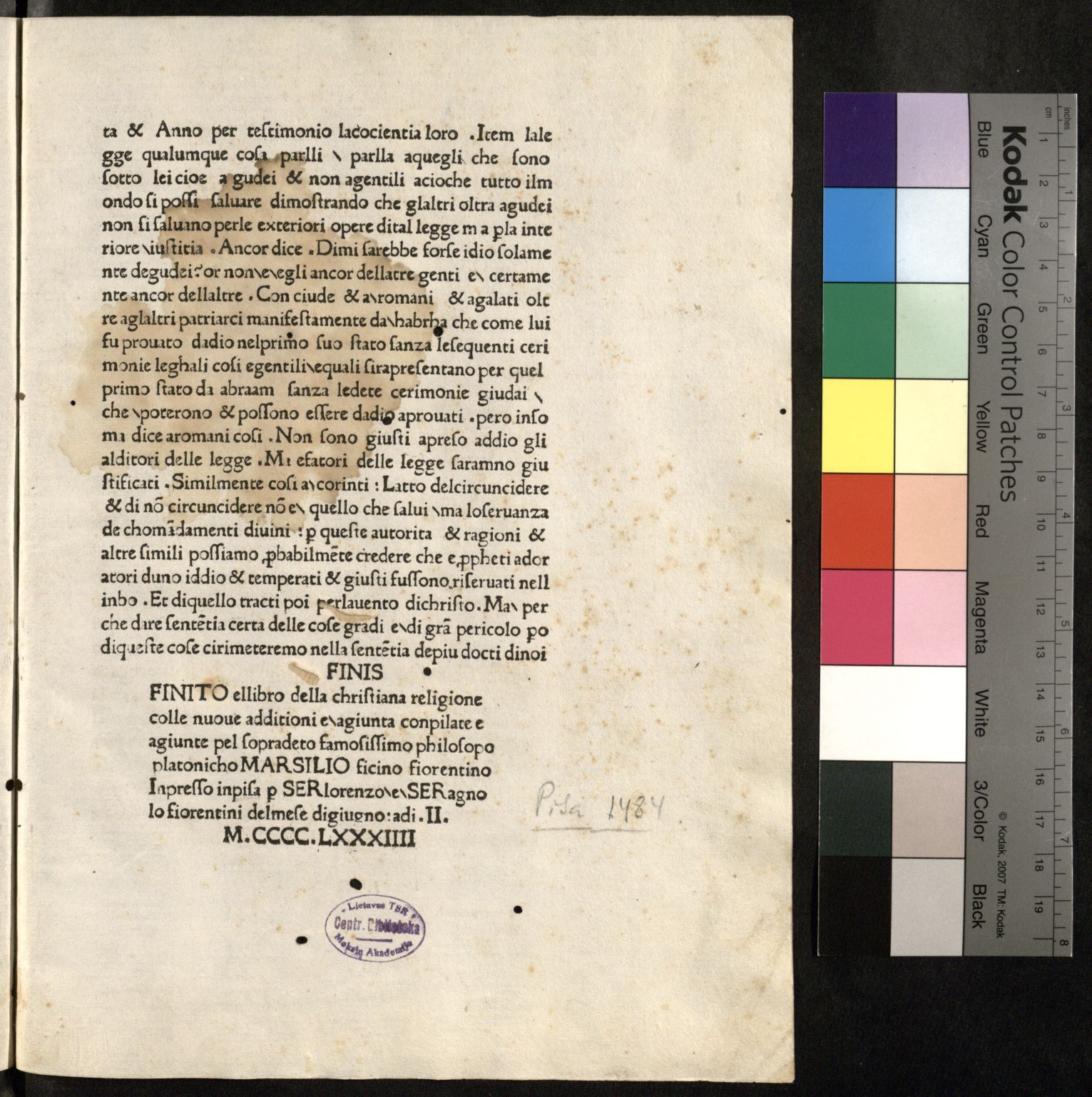 Della cristiana religione. Pisa : [per] Lorenzo e Agnolo fiorentini, del mese digiugno adi. II. M. CCCC. LXXXIIII [1484 06 02]. 112 nenumeruotų lapų.