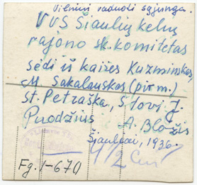 Vilniui vaduoti sąjungos Šiaulių kelių rajono tarnautojų skyriaus komitetas, [Šiauliai] : [leidėjas nenustatytas], [1936], 1 fotografija : nespalvota ; 6.4 x 6.9 cm.