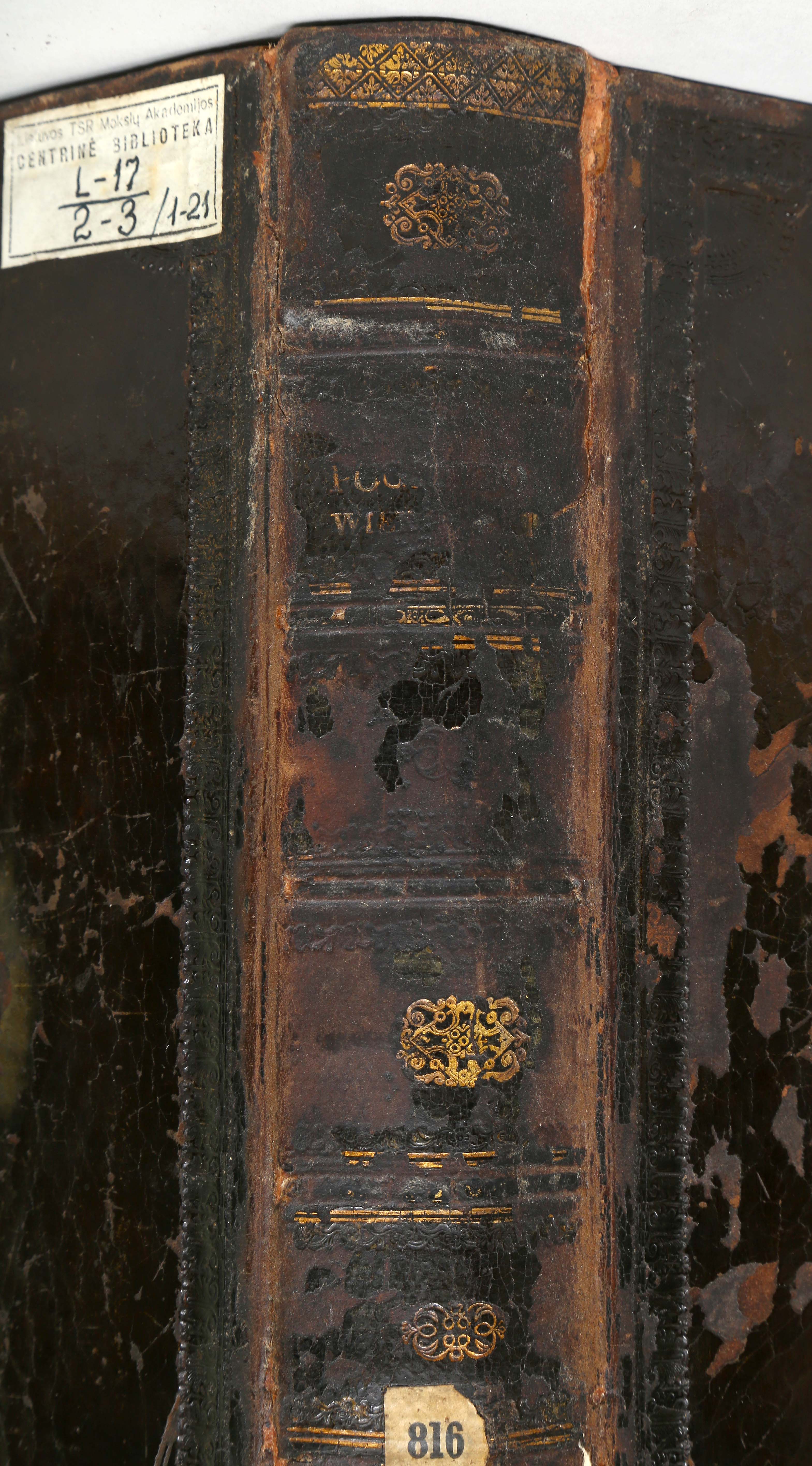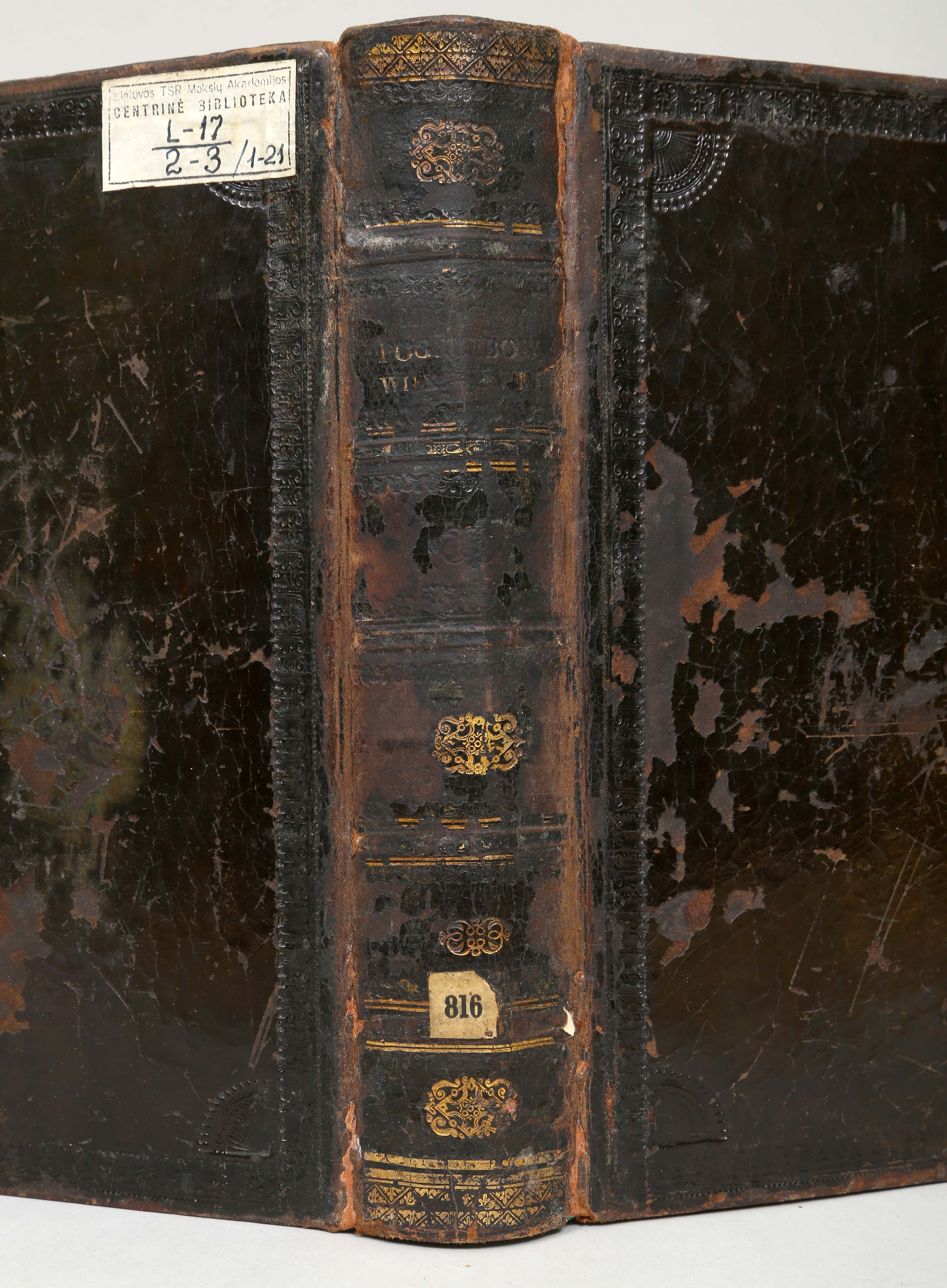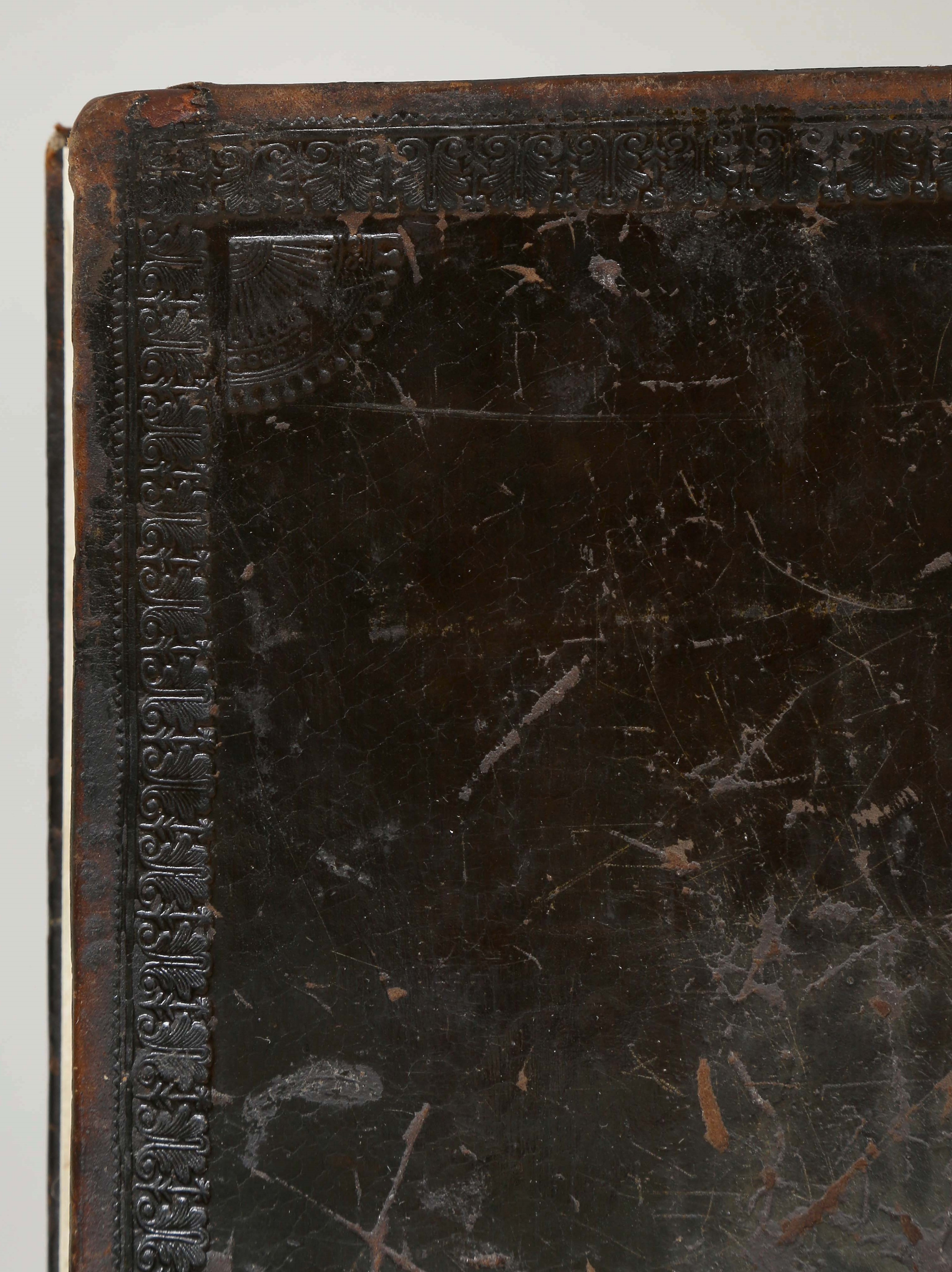 Įrišas: vientisas. Medžiagos: oda nenustatyta. Viršelio oda – vienspalvė. Įspaudai: viršelio kraštinėse – įvairių spaudų kompozicija; viršelio nugarėlėje – įvairių paauksintų spaudų kompozicija. Antrame nugarėlės segmente įspausti antraštiniai duomenys (neįskaitomi).