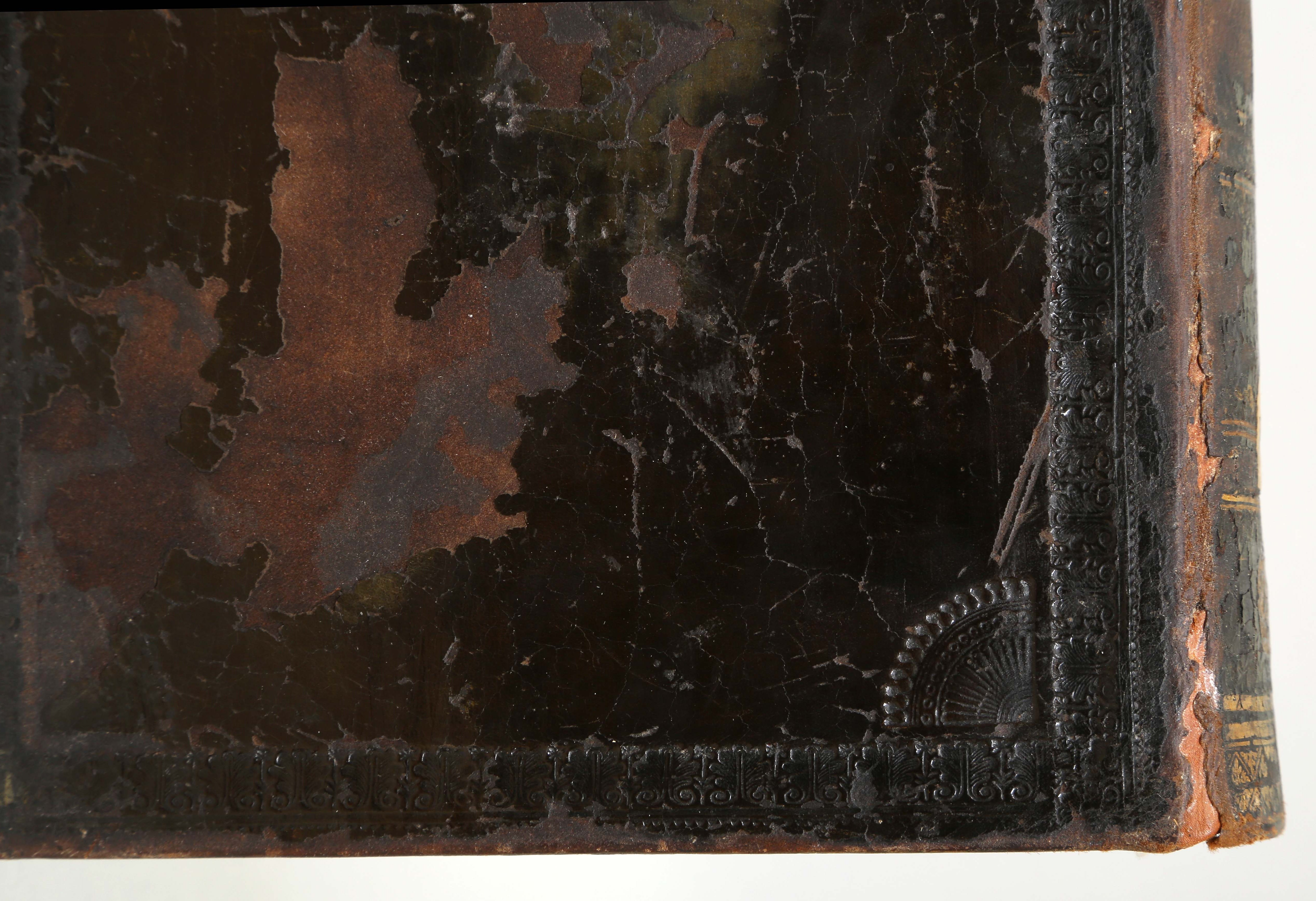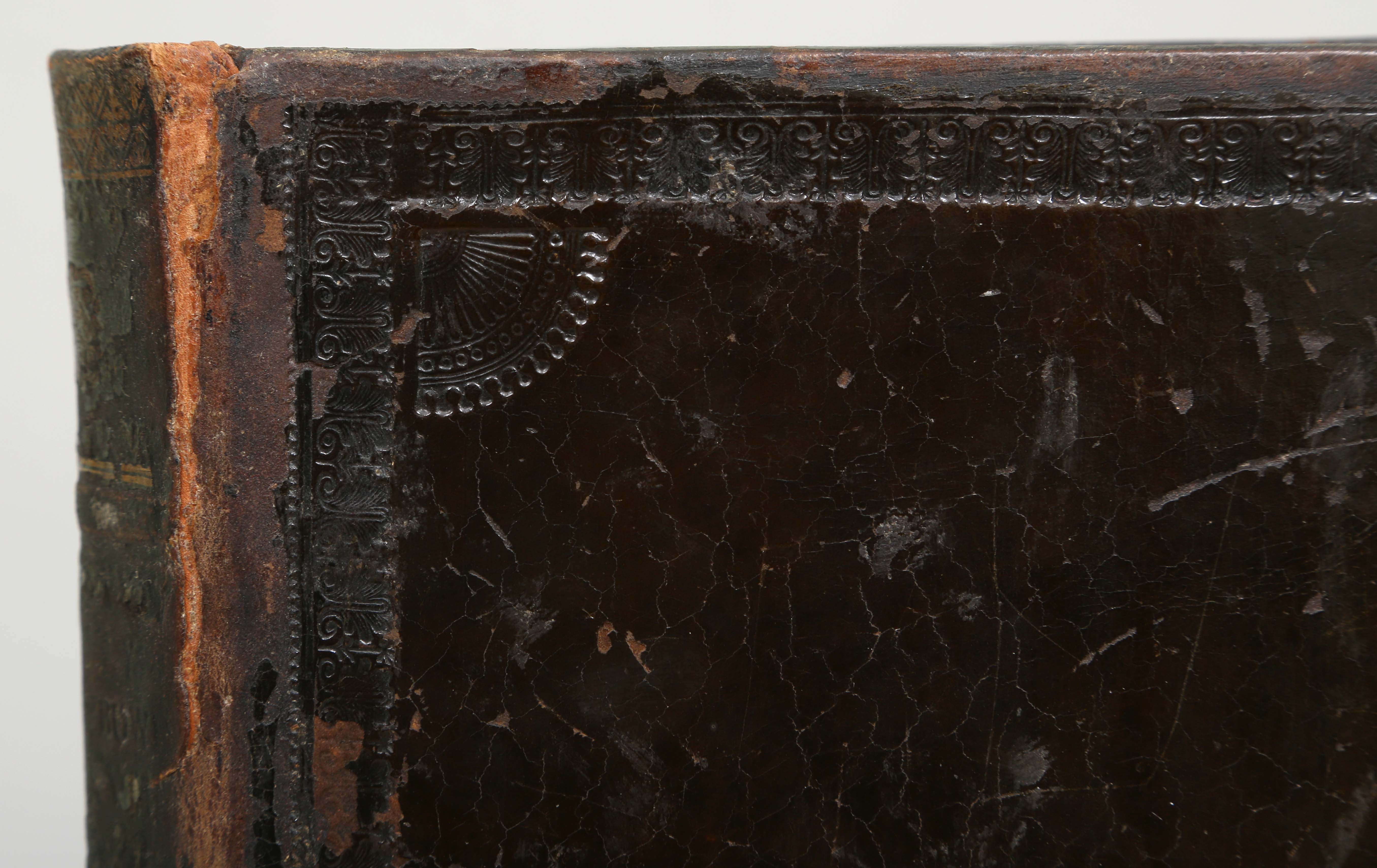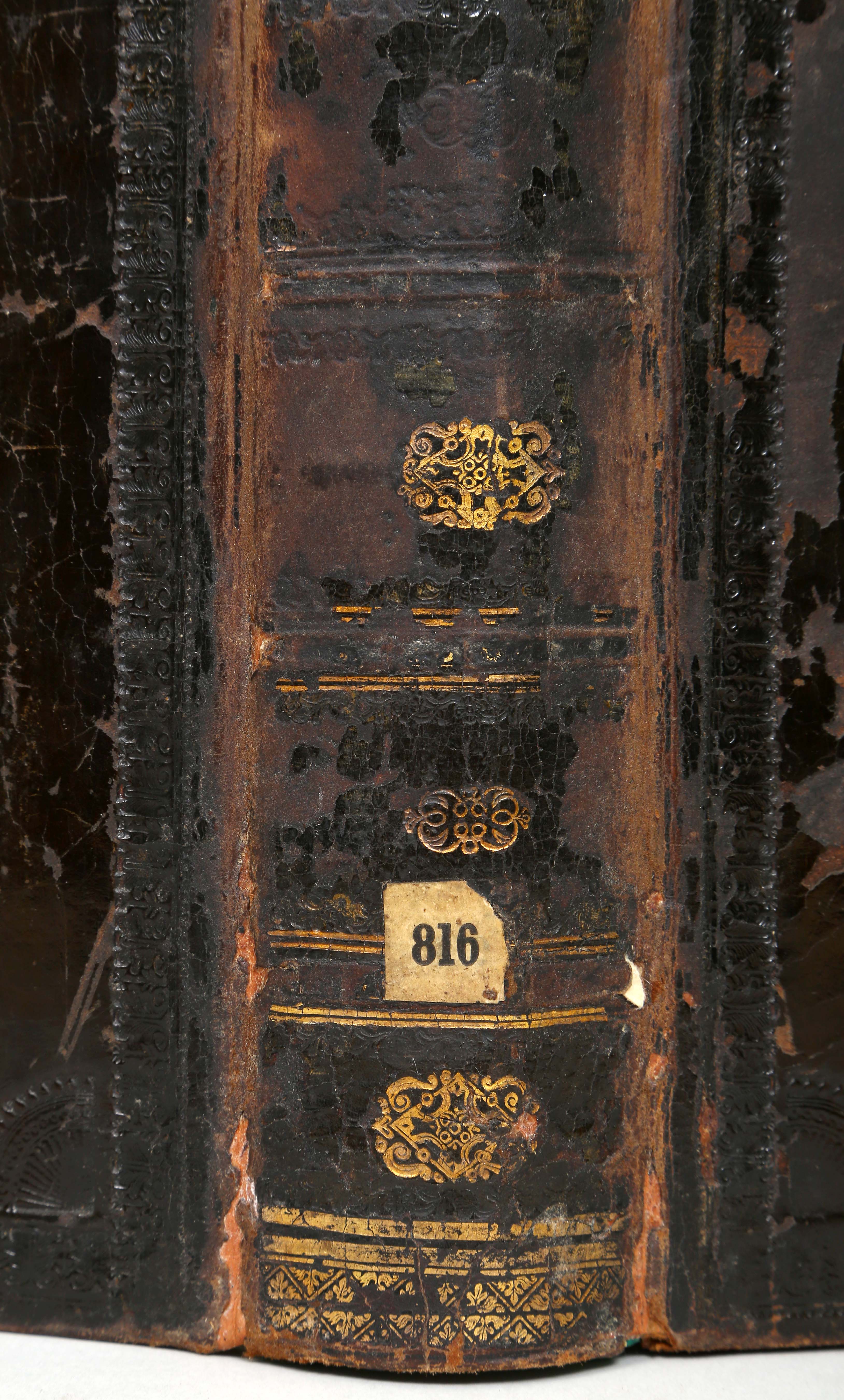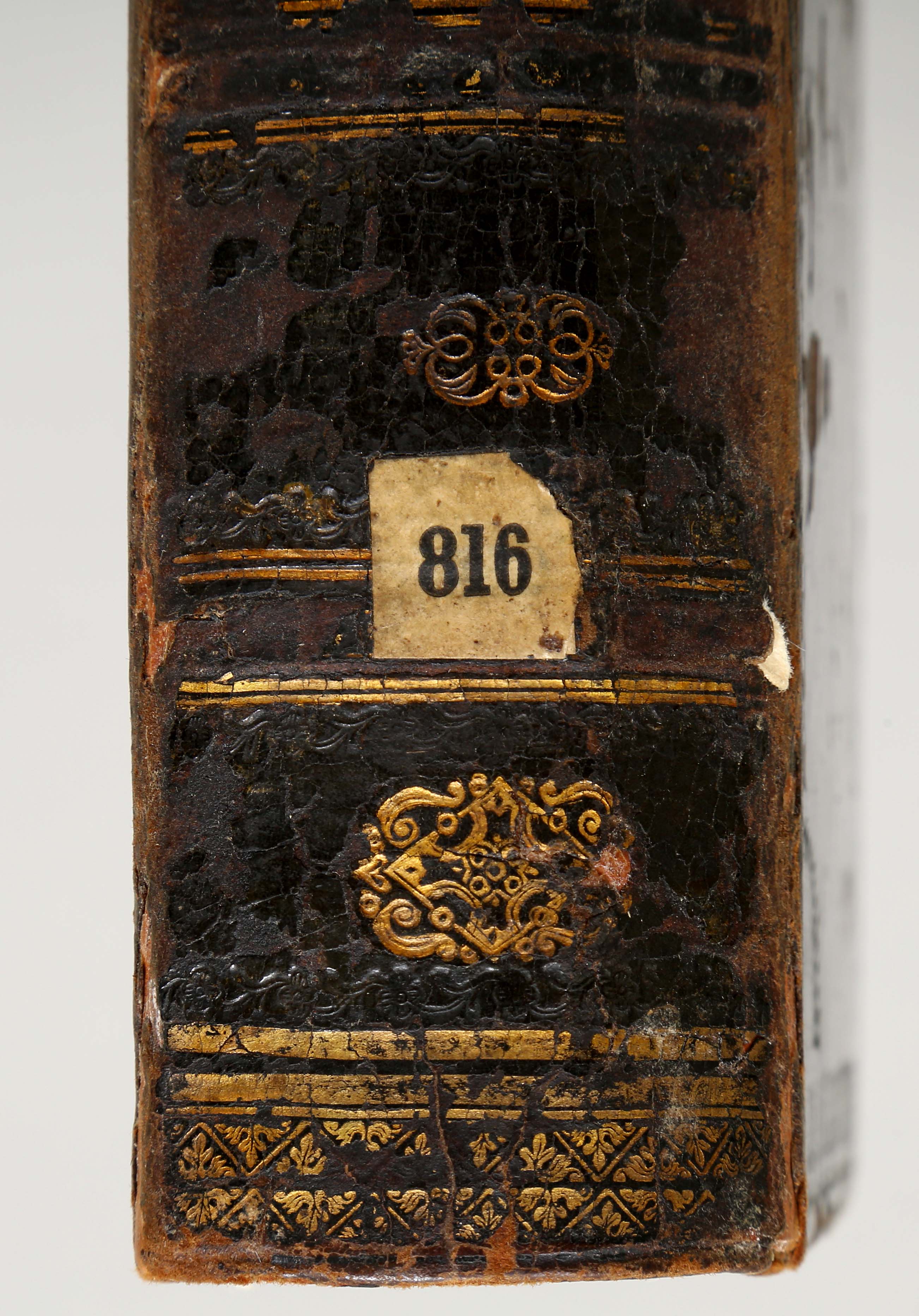 Įrišas: vientisas. Medžiagos: oda nenustatyta. Viršelio oda – vienspalvė. Įspaudai: viršelio kraštinėse – įvairių spaudų kompozicija; viršelio nugarėlėje – įvairių paauksintų spaudų kompozicija. Antrame nugarėlės segmente įspausti antraštiniai duomenys (neįskaitomi).