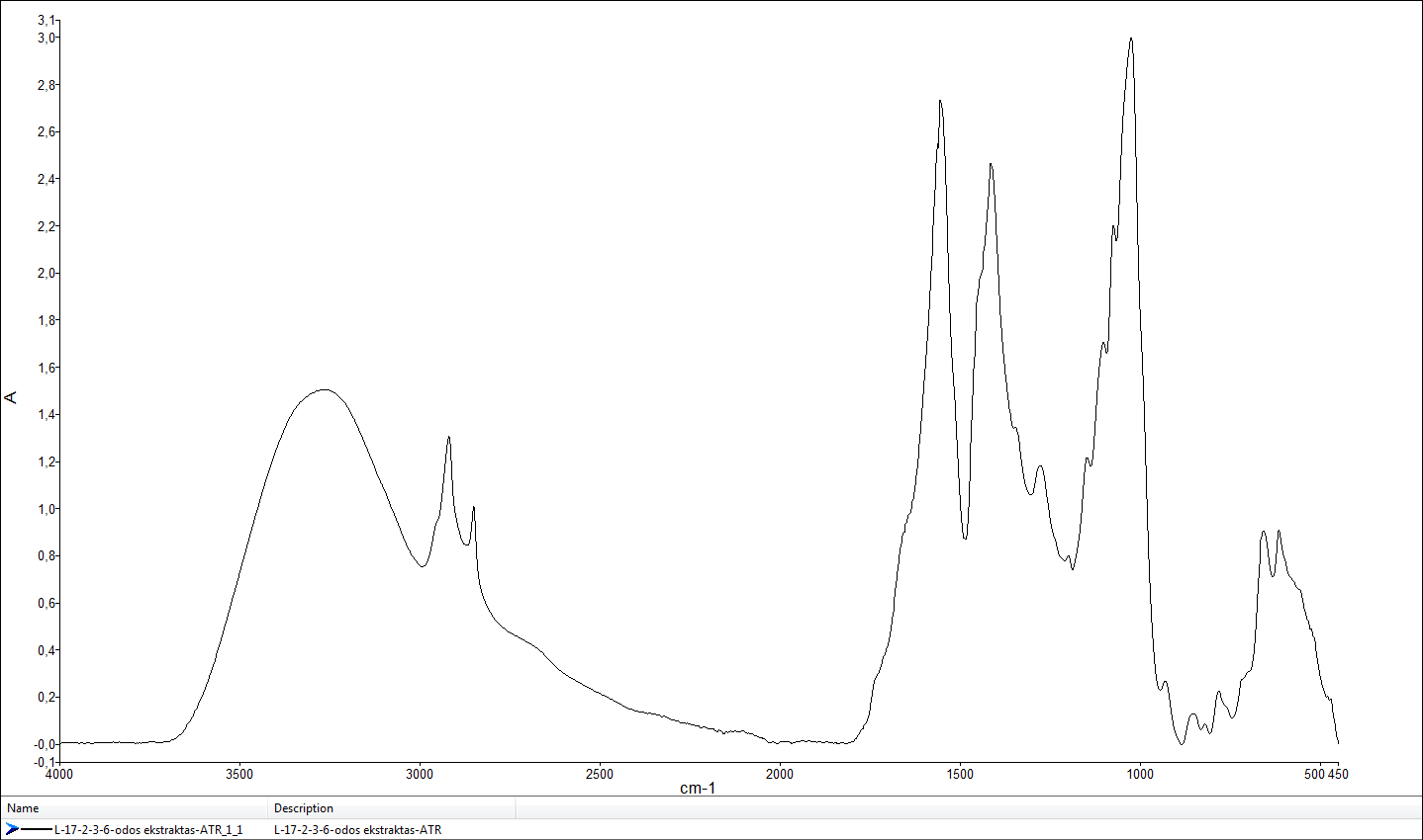 Mikrocheminiai ir instrumentiniai tyrimai: pH - 4,3; Geležies chlorido testas – teigiamas; Vanilino testas – teigiamas; Nitritinės rūgšties testas – neigiamas; Rodanino testas – teigiamas; Taninų klasė – hidrolizuojami ir kondensuoti taninai; ATR-FTIR spektroskopija – Galo ir kondensuoti taninai.
