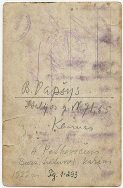Lietuvos kariuomenės savanoris Balys Vapšys su draugais : [portretas], [Kaunas], [1922], 1 fotografija ; 14 x 9 cm.