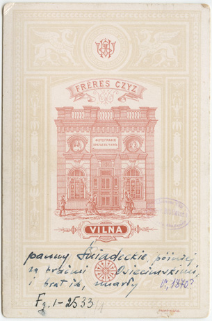 Įrašas po fotografija: Czyż Frères. Vilna. Kitoje pusėje fotokortelė ir įrašas lenkų kalba