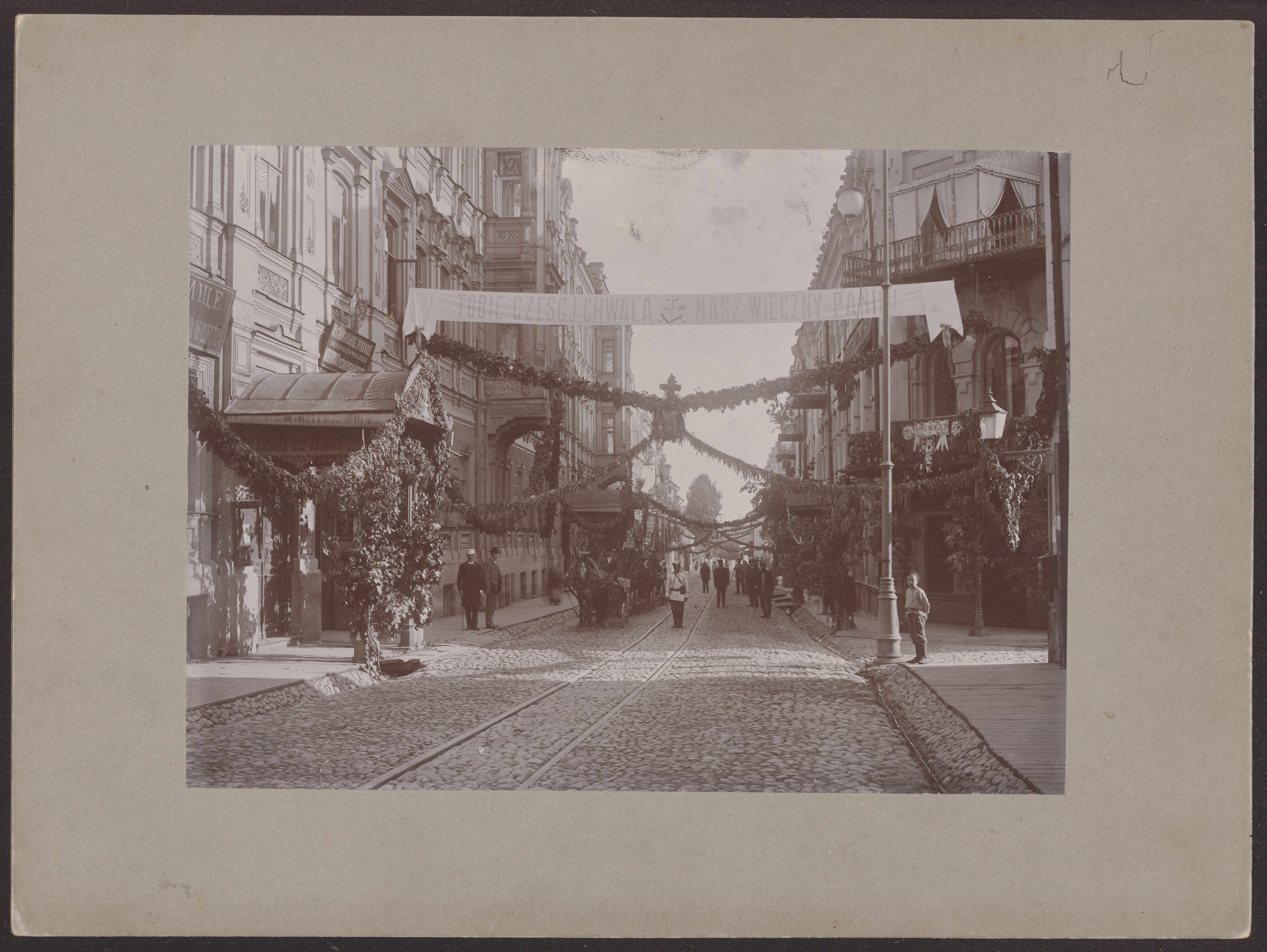 Dievo Kūno procesija Vilniaus gatvėje, Vilniuje 1906 m. / [fot. J. Hermanowicz], Vilnius : [Фотографiя "Экономiя"], [1906], 4 fotografijos : nespalvotos ; 17 x 12 cm ; 23 x 17 cm.