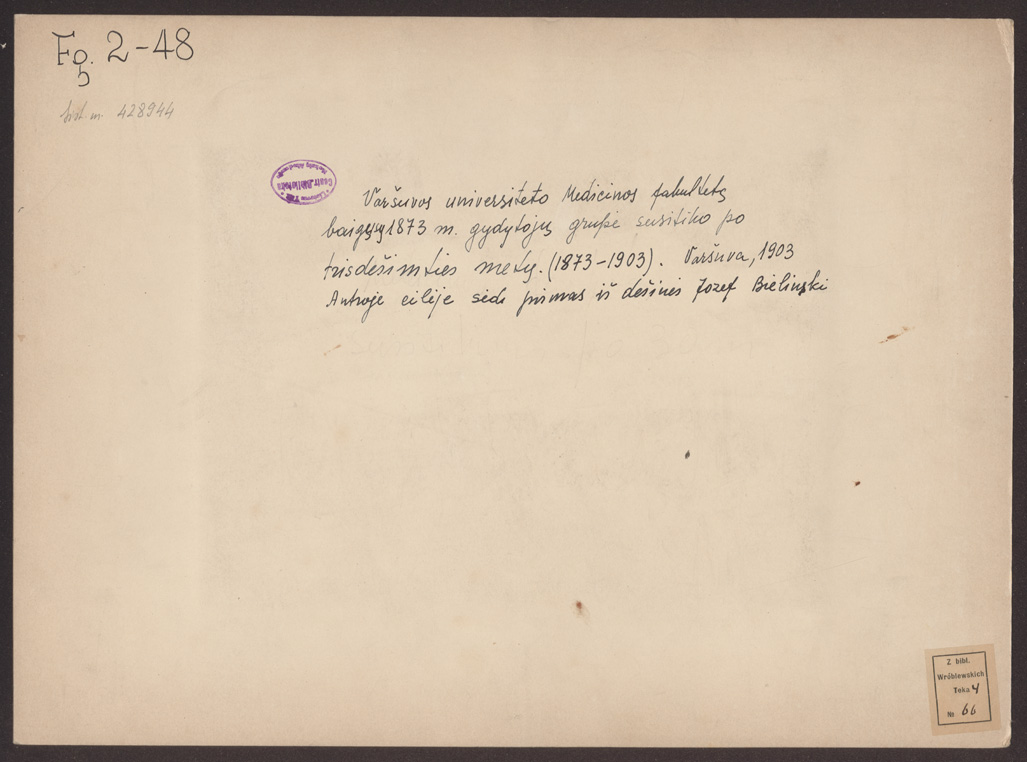 Varšuvos vyriausiosios mokyklos Medicinos fakultetą 1873 m. baigusių studentų susitikimas po 30 metų : [grupinė fotografija], [Varšuva] : [leidėjas nenustatytas], 1903, 1 fotografija : nespalvota ; 17 x 23 ; 26.6 x 36.2 cm.