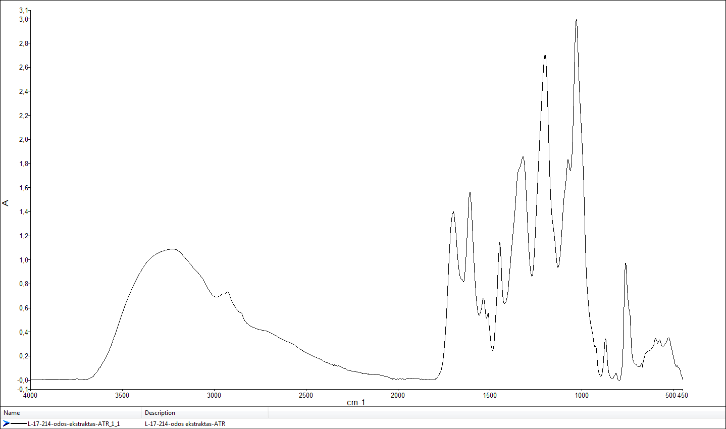 Mikrocheminiai ir instrumentiniai tyrimai: pH - 5,1; Geležies chlorido testas - teigiamas; Vanilino testas - neigiamas; Nitritinės rūgšties testas - neigiamas; Rodanino testas - teigiamas; Taninų klasė - Hidrolizuojami taninai; ATR-FTIR spektroskopija - Galo taninai.