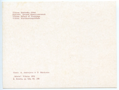 Vilnius. Santuokų rūmai = Вильнюс. Дворец бракосочетания = Vilnius. Palace of Weddings = Vilnius. Standesamtsgebäude / nuotr. A.Andrejevo ir D.Mackonio, Vilnius : Mintis, 1976, 1 atvirukas : spalvotas ; 10.2 x 13.7 cm.