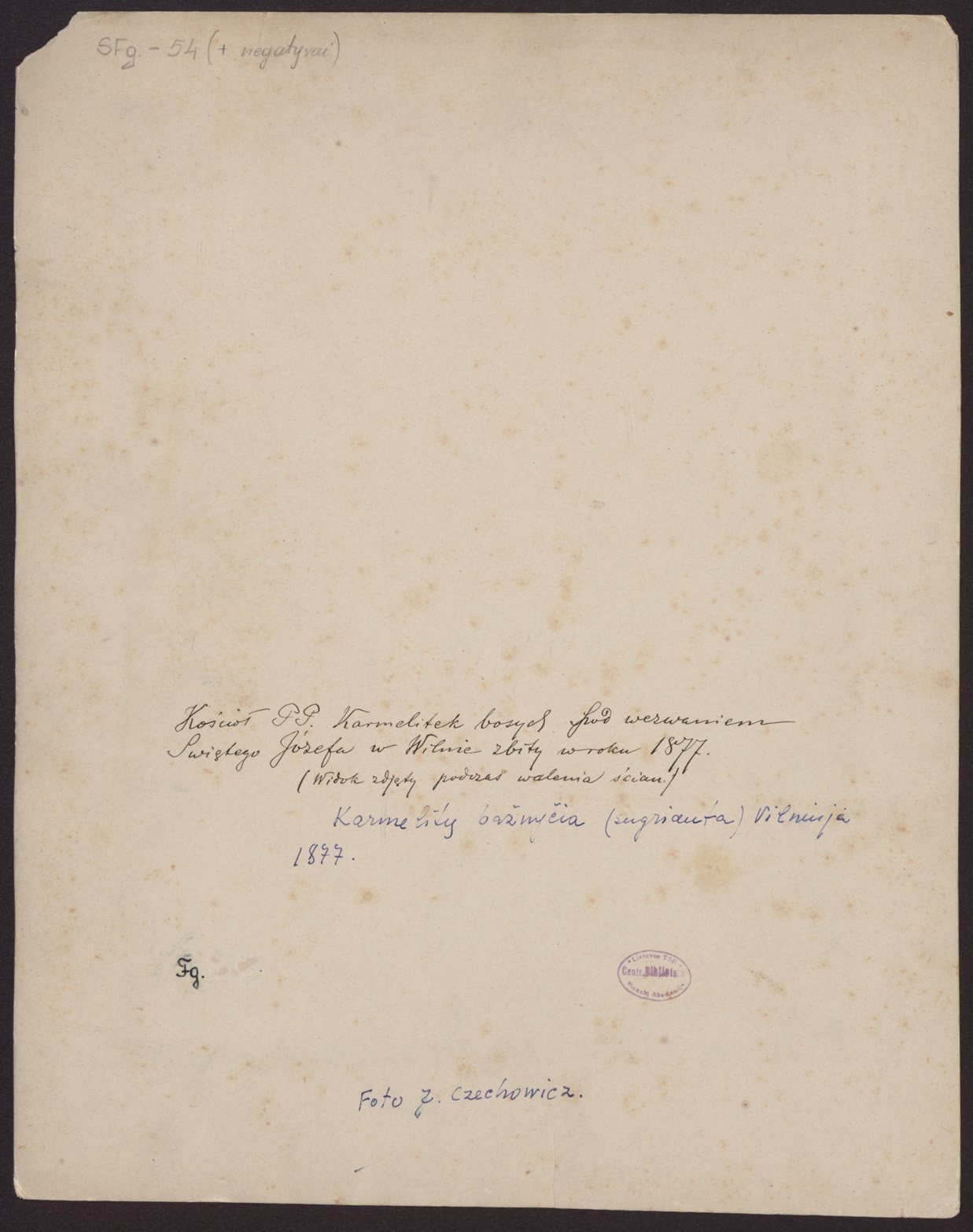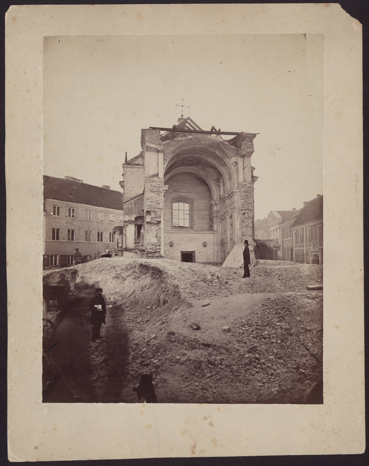 Kościół PP. Karmelitek Bosych pod wezwaniem Świętego Józefa w Wilnie : zbity w roku 1877. (Widok zdjęty podczas walenia ścian) : [griaunama Šv. Juozapo Sužadėtinio bažnyčia] / [fot. J. Čechavičiaus], [Vilnius] : [J. Čechavičius], 1877, 1 fotogr. ; 31,3x24 ; 38,6x30,5 cm.