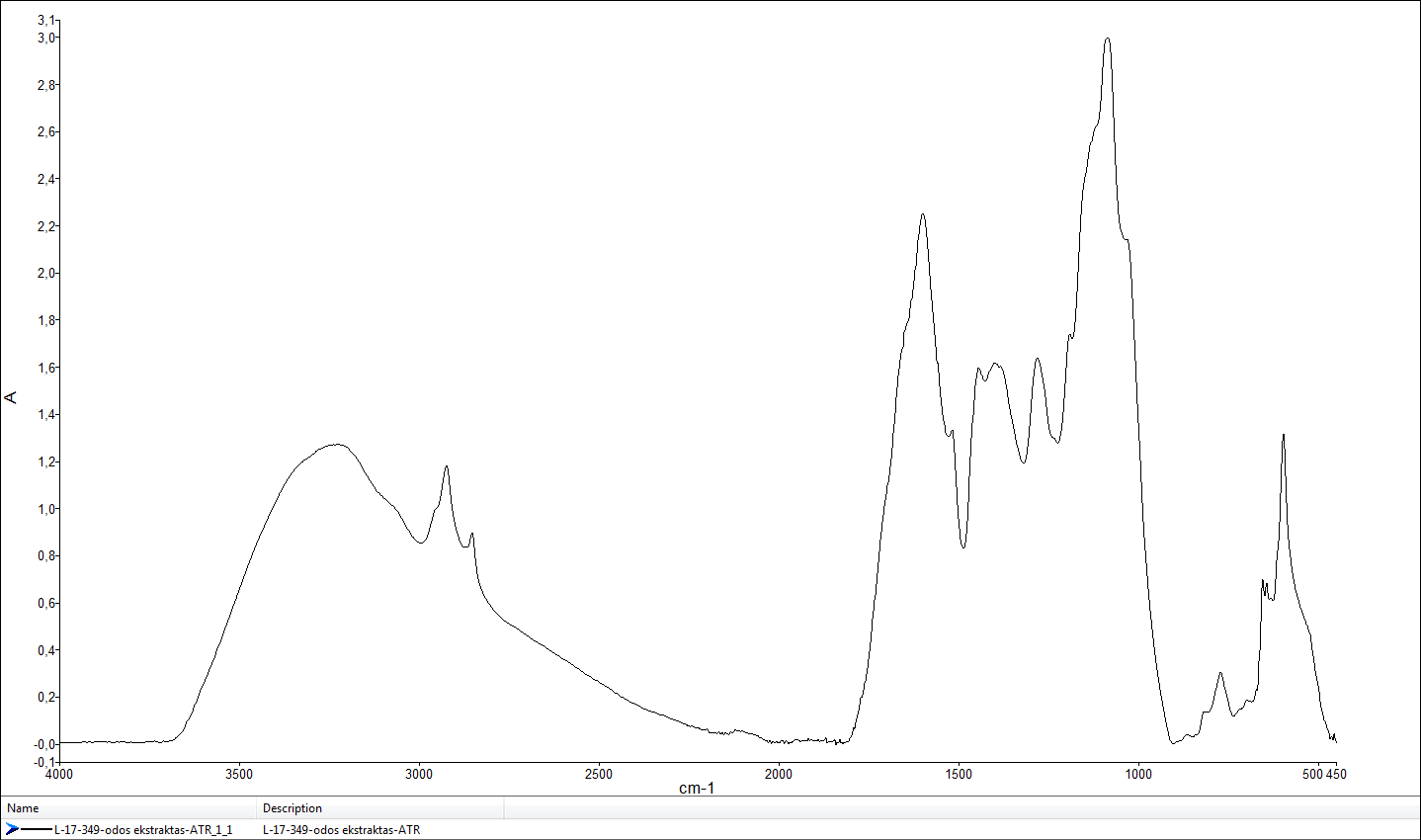 | dc.description | Mikrocheminiai ir instrumentiniai tyrimai: pH - 4,2; Geležies chlorido testas - teigiamas; Vanilino testas - teigiamas; Nitritinės rūgšties testas - neigiamas; Rodanino testas - teigiamas; Taninų klasė - Hidrolizuojami ir kondensuoti taninai; ATR-FTIR spektroskopija - Galo ir kondensuoti taninai. | |