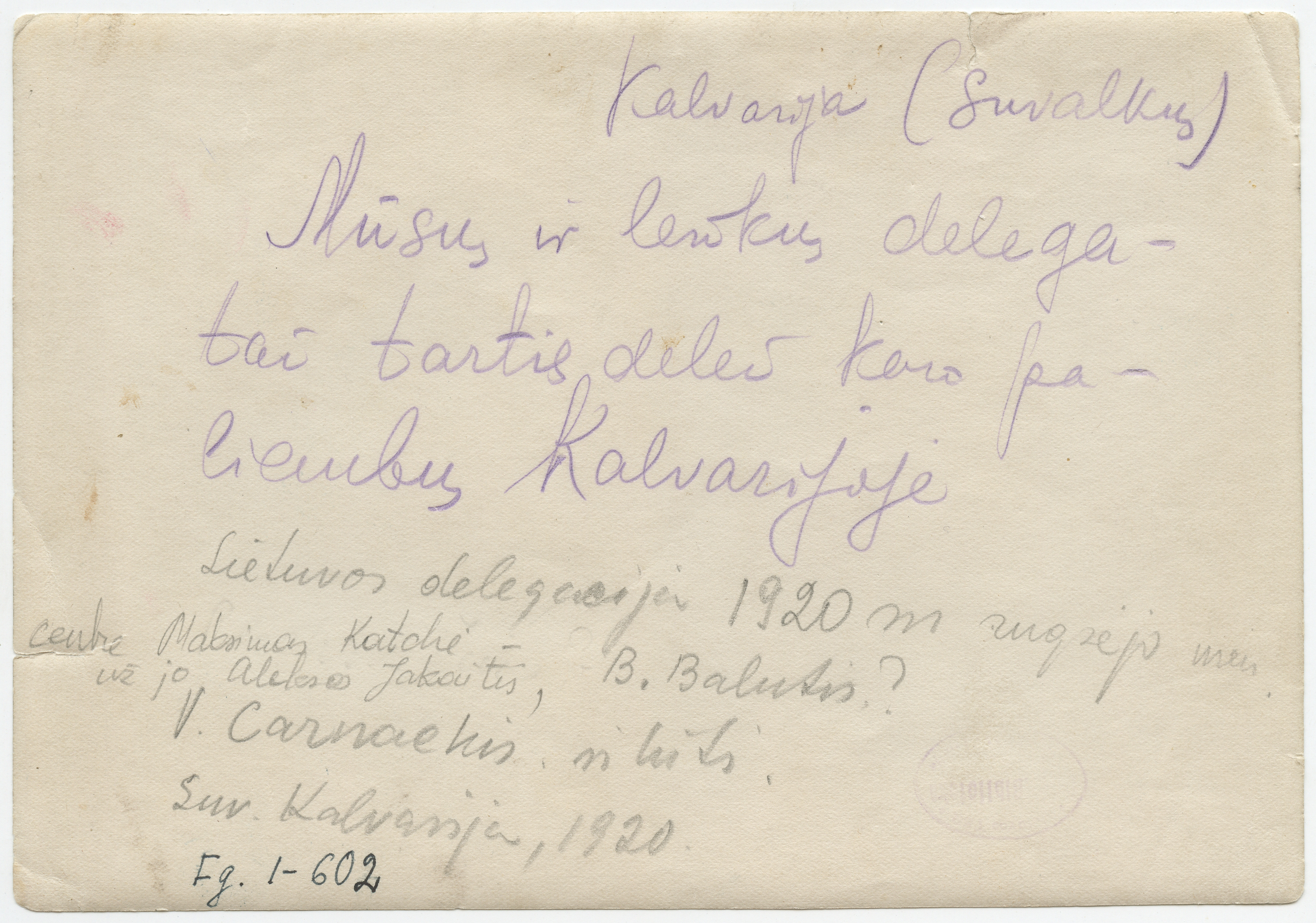 Lietuvos ir Lenkijos kariuomenių delegatų susitikimas Kalvarijoje 1920 m. rugsėjo 14 d. : [derybos dėl paliaubų], [Kalvarija] : [leidėjas nenustatytas], [1920], 1 fotografija : tonuota ; 12.5 x 18 cm.