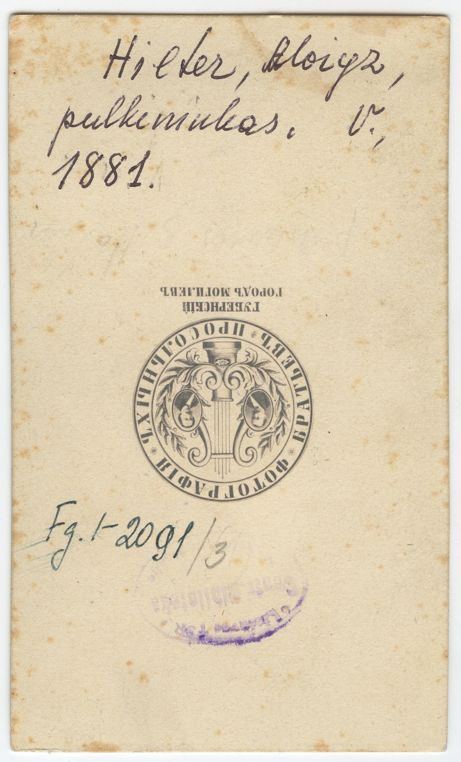 Pulkininko Aloizy Hitter portretas / фотографiя братьевъ Просольныхъ, Могилев : фотографiя братьевъ Просольныхъ, [1880], 1 fotografijа : nespalvota ; 9.4 x 5.9 cm ; 10.2 x 6.1 cm.