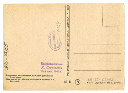 Žuvusiems tarybiniams kariams paminklas Šiauliuose = Памятник погибшим советским воинам в г. Шауляй, Kaunas : Valst. mokslo lit. l-kla, 1948, 1 spalvotas atvirukas : 14 x 10.1 cm.