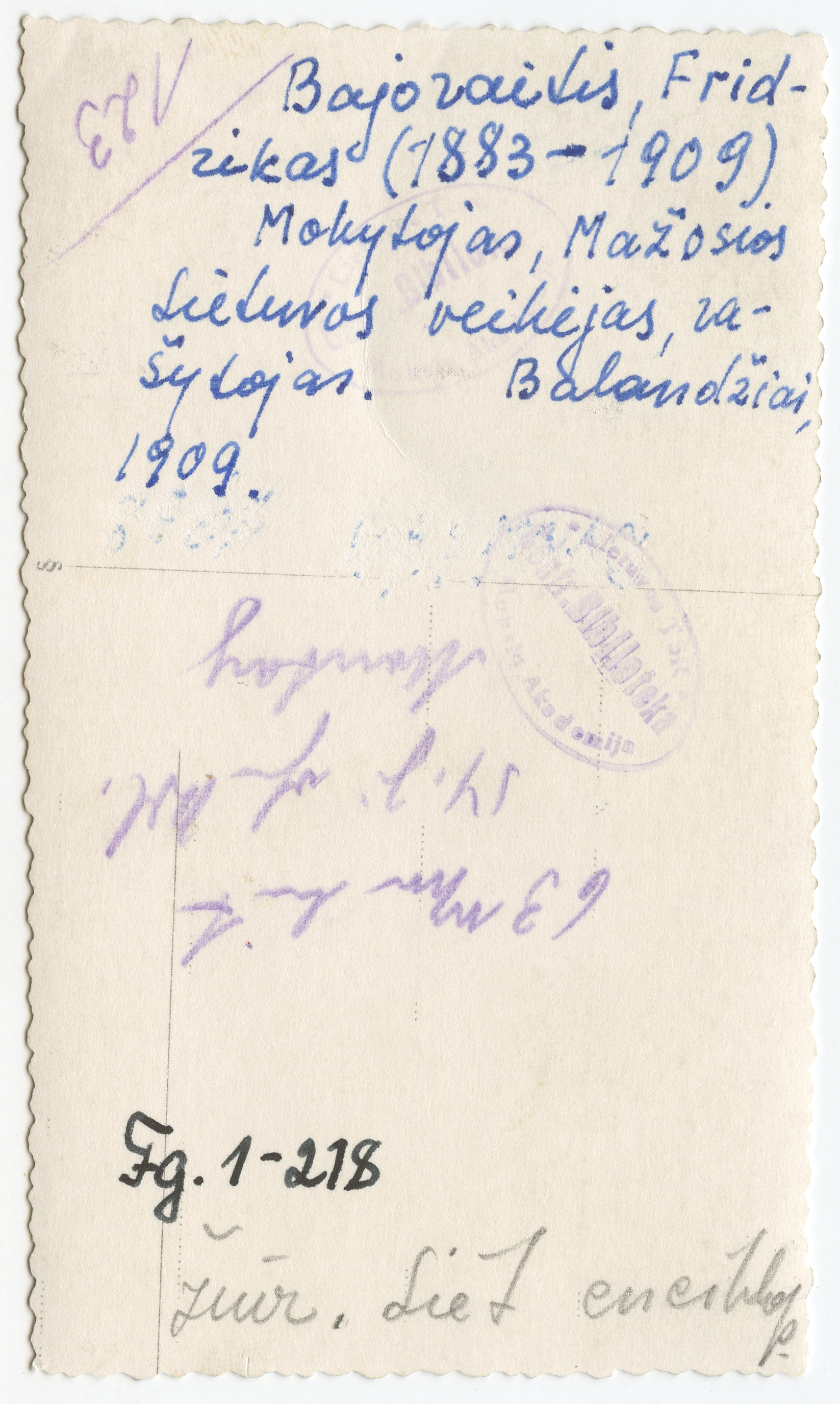 Poetas Fridrichas Bajoraitis-Paukštelis : [portretas], [Publikavimo vieta nenustatyta] : [leidėjas nenustatytas], [19--?], 1 fotografija : nespalvota ; 11.2 x 6.5 cm.