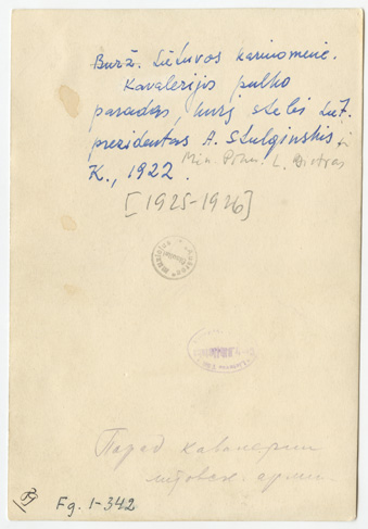 Lietuvos kariuomenės kavalerijos pulko paradas Kaune : [paradą stebi Prezidentas A.Stulginskis ir ministras pirmininkas L.Bistras], [Kaunas], [1925-1926], 1 fotografija ; 17.2 x 11.8 cm.