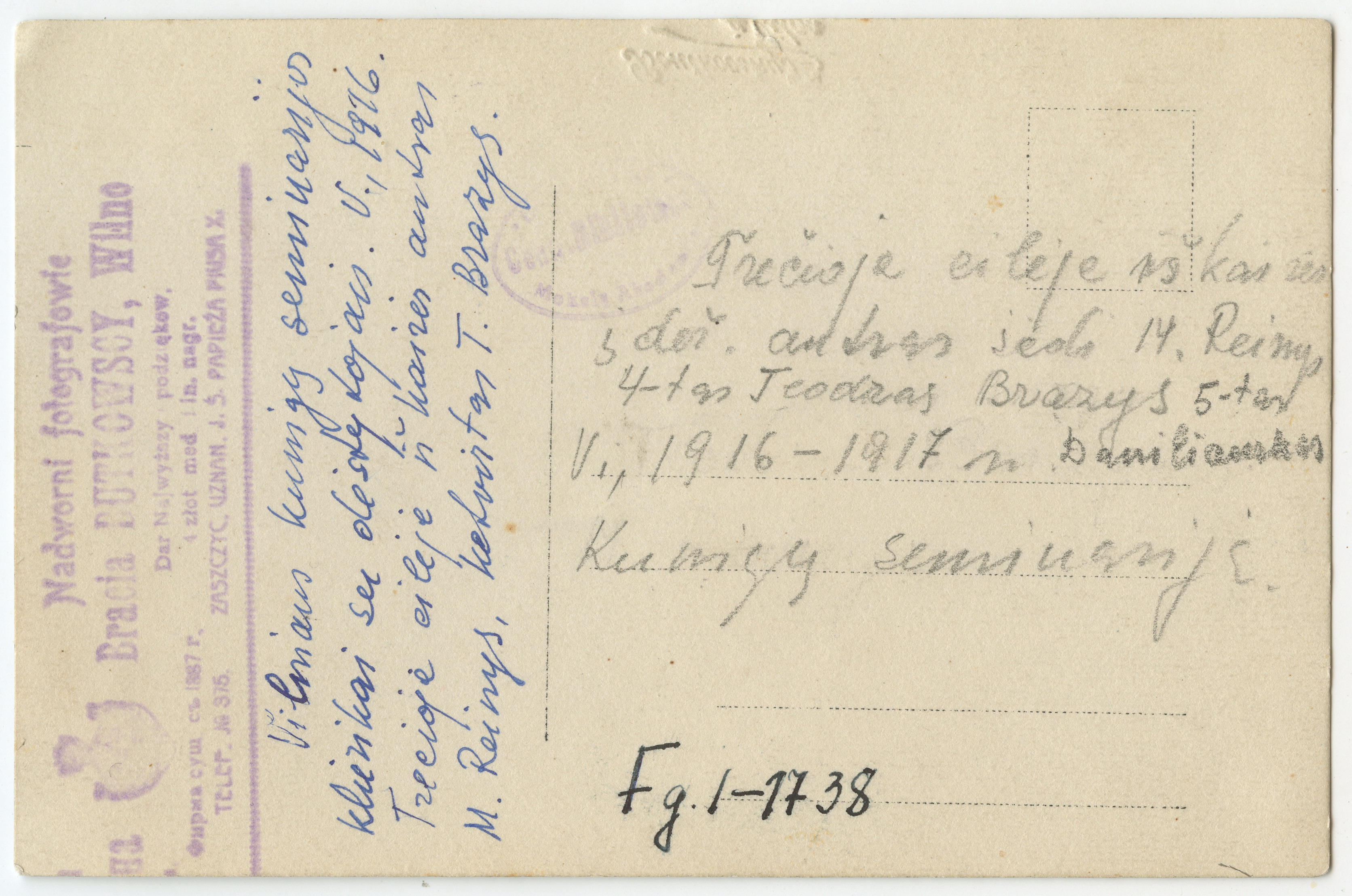 Vilniaus kunigų seminarijos auklėtiniai ir dėstytojai / Boutkovsky Fr., Vilna : [nadworni fotografowie Bracia Butkowscy], [1910], 1 fotografija : nespalvota ; 9 x 13.8 cm.