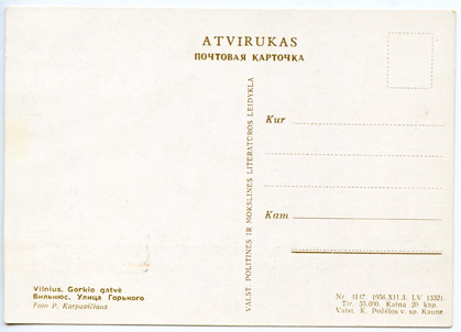 Vilnius. Gorkio gatvė : Вильнюс. Улица Горького / foto P.Karpavičiaus, Vilnius : Valst. politinės ir mokslinės literatūros leidykla, 1956, 1 atvirukas : spalvotas ; 10.5 x 14.8 cm.