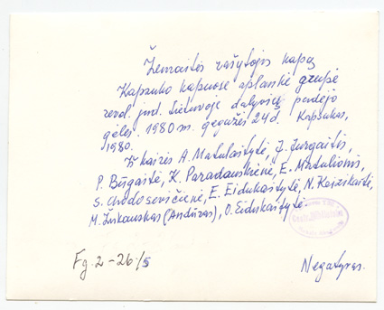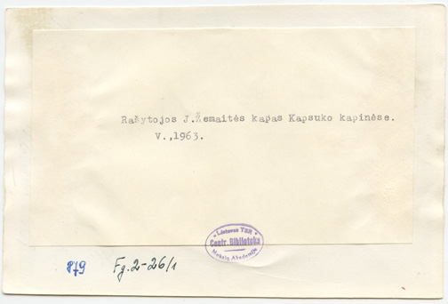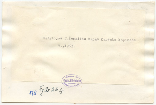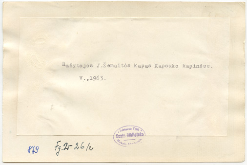 Prie rašytojos Žemaitės kapo senosiose Kapsuko (dabar Marijampolė) kapinėse : [mėgėjiškos fotografijos], Marijampolė : [leidėjas nenustatytas], [1962-1980], 5 fotografijos : nespalvotos ; 12 x 18 ; 11.6 x 14.9 cm.