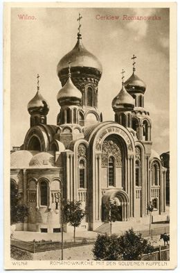 Wilno. Cerkiew Romanowska = Wilna. Romanowkirche mit den goldenen Kuppeln, [Wilno] : Verlag M. & G., [1914-1918], 1 atvirukas : tonuotas ; 14 x 9.1 cm.