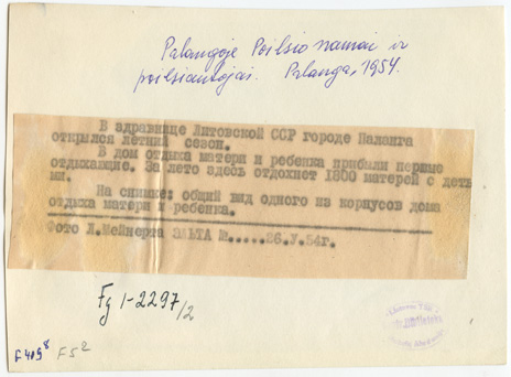 Motinos ir vaiko poilsio namai Palangoje : [moterys su vaikais poilsio kambaryje ir prie poilsio namų] / фото Л.Мейнерта, [Vilnius] : [ELTA], [1954], 2 fotografijos : nespalvotos ; 16.5 x 11.5 cm.
