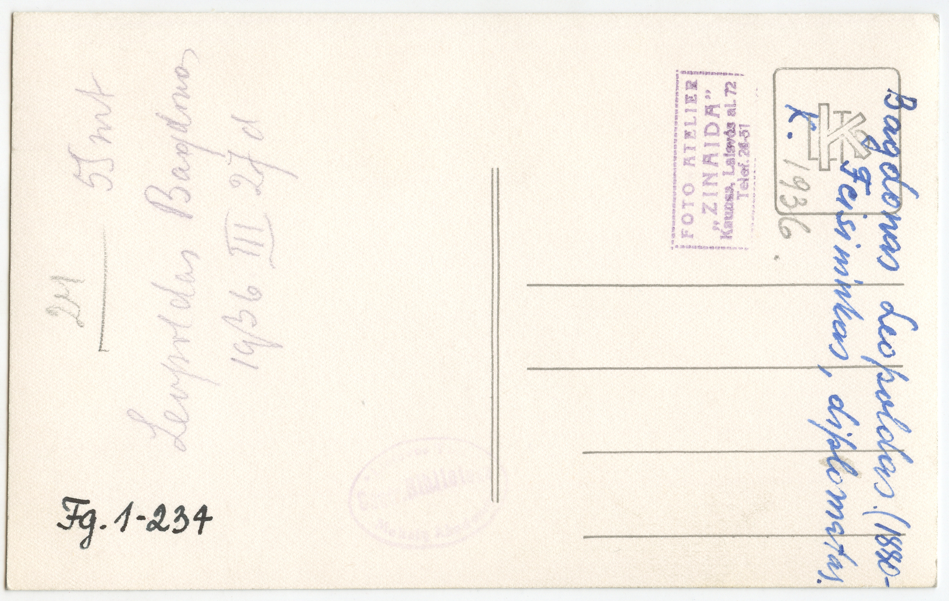 Leopoldas Bagdonas : [Lietuvos pasiuntinybės atstovas Maskvoje 1924-1925 m. : portretas] / fotoatelje „Zinaida“, Kaunas : foto-atelje „Zinaida“, 1936, 1 fotografija : nespalvota ; 13.7 x 8.6 cm.