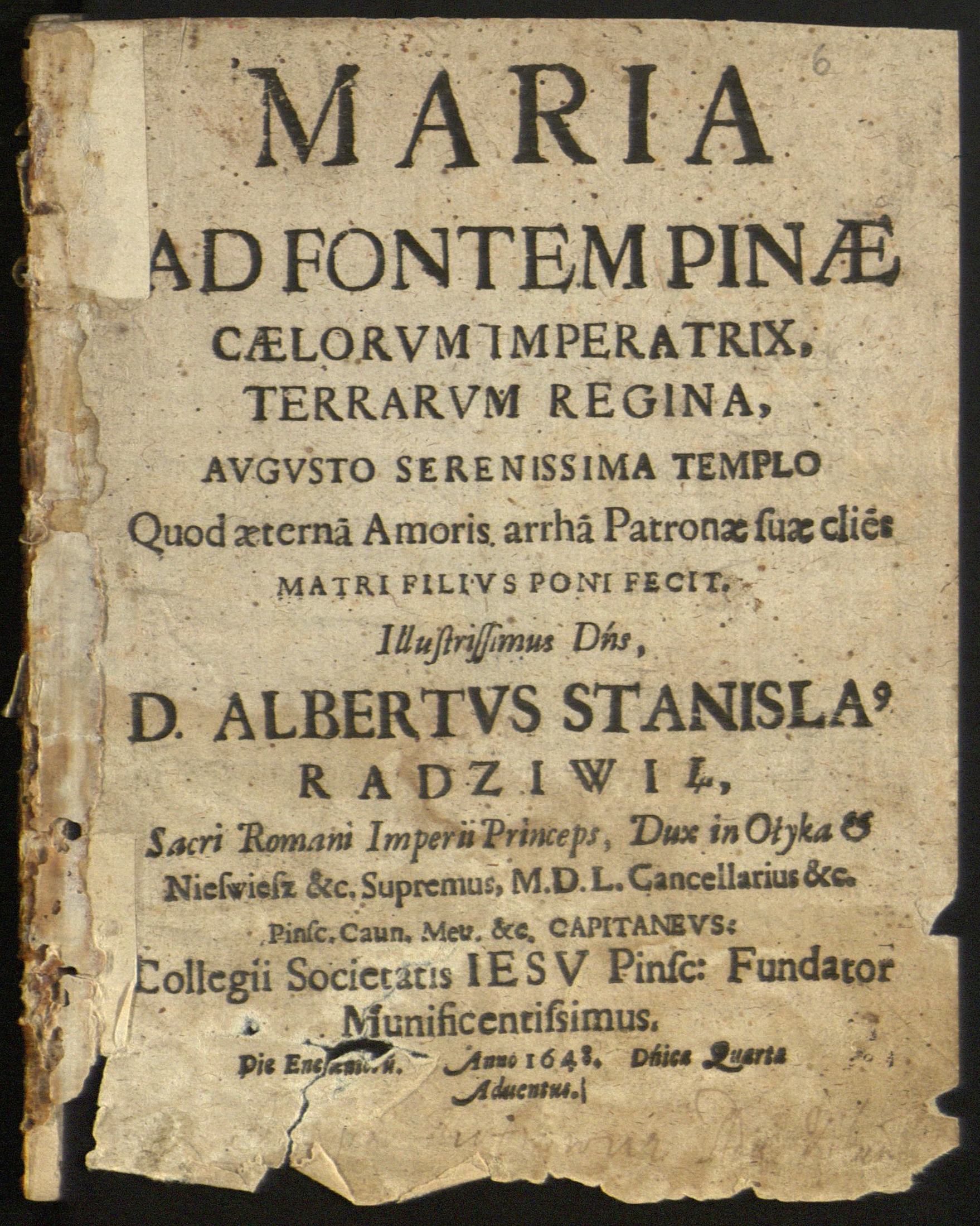 Įrišas knygos [Radvila, Albrechtas Stanislovas. Maria ad fontem pinae caelorum imperatrix, terrarum regina, [...]. [Vilnae : typis Academicis S.I., 1648].]