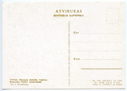 Vilnius. Naujųjų statybų rajonas = Вильнюс. Район новостроек / foto J.Kacenbergo, Vilnius : Valst. polit. ir moksl. lit. l-kla, 1956, 1 atvirukas : spalvotas ; 10.5 x 14.8 cm.