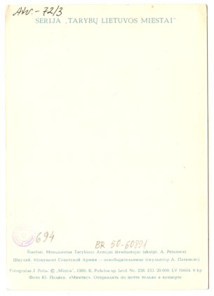 Šiauliai - 750 m. : monumentas Tarybinei Armijai išvaduotojai (skulpt. A. Patamsis) / fotogr. J. Polis, Vilnius : Mintis, 1986, 1 spalvotas atvirukas ; 14.7 x 10.4 cm.