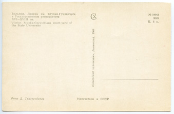 Вильнюс. Дворик им. Стуоки-Гуцявичуса в Государственном университете XVI-XVIII вв. = Vilnius. Stuoka-Gucevičiaus court-yard of the State University / фото Д.Трахтенберга, Ленинград : Советский художник, 1969, 1 atvirukas : spalvotas ; 14 x 9 cm.