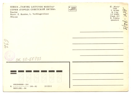 Šiauliai = Шяуляй / nuotr. Z. Kazėno, L. Verbliugevičiaus, Vilnius : "Mintis", 1984, 1 spalvotas atvirukas ; 10.5 x 14.8 cm.