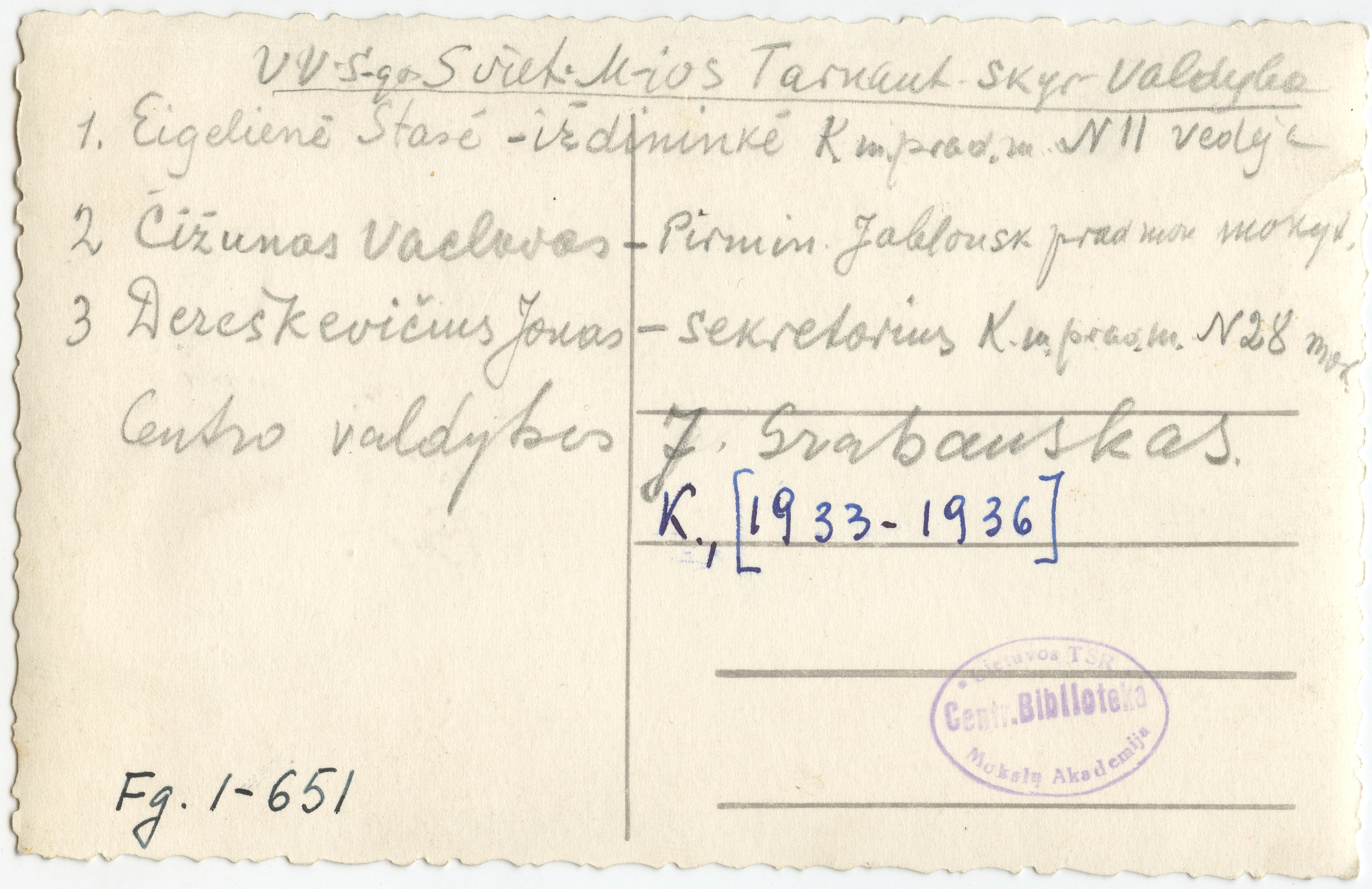 Švietimo ministerijos Tarnautojų skyriaus valdybos Vilniui Vaduoti Sąjungos nariai, [Kaunas] : [leidėjas nenustatytas], [1933-1936], 1 fotografija : nespalvota ; 13,4 x 8.5 cm.