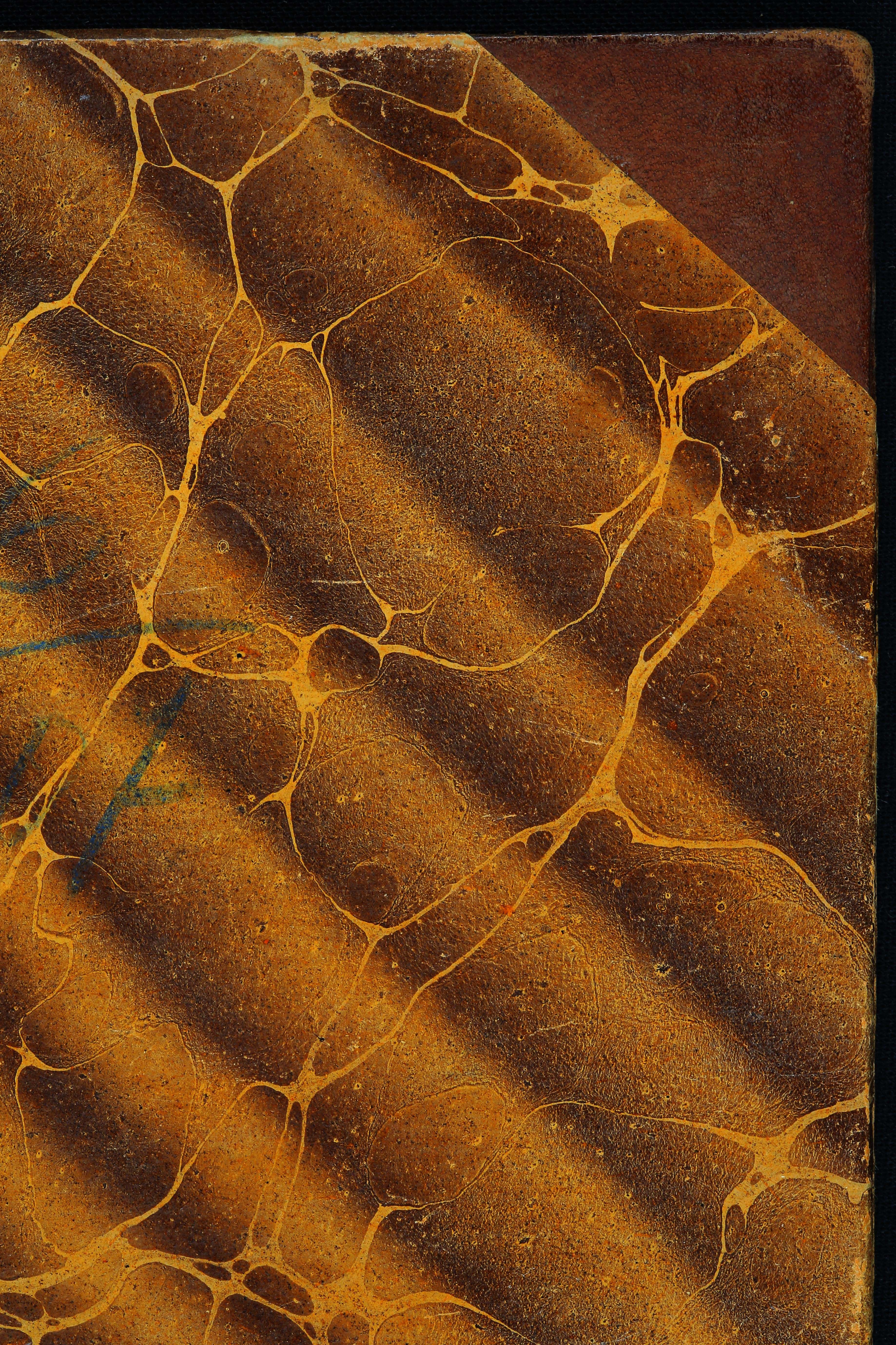 Įrišas: sudėtinis. Medžiagos: ožkenos oda, popierius. Viršelio oda – vienspalvė. Paauksintų įspaudų kompozicija odinėje nugarėlėje. Viršelio viršutinės dalies viršuje (ir nugarėlėje) priklijuota prieklija su įspaustais antraštiniais duomenimis. Prieklija popierinė, vienspalvė. Viršelio popierinės dangos dekoro technika – marginta plūduriuojančiais dažais.