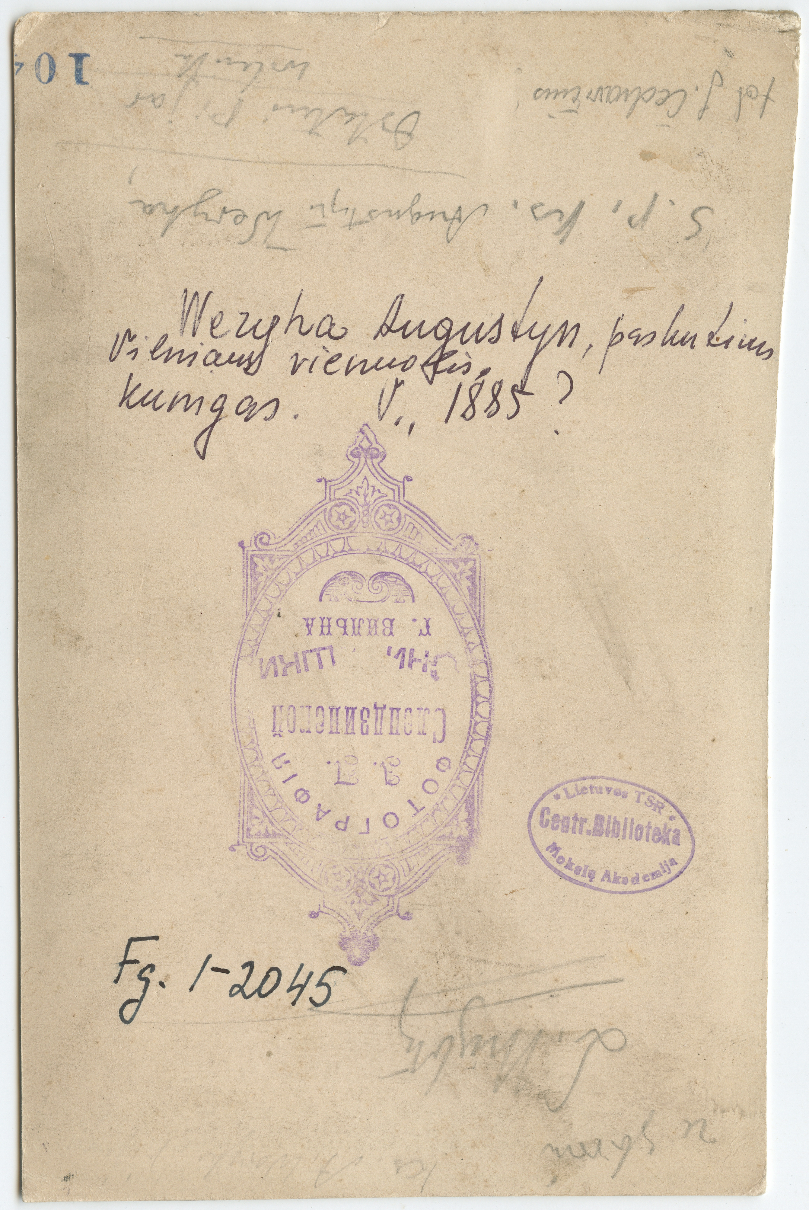 Ksiądz Augustyn Weryha : [Vilniaus vyskupijos katedros kapitulos garbės kanauninkas] : [portretas] / [fot. J. Čechavičius ; A. Slendzinska], [Vilnius] : [A. Slendzinska], [1889], 1 fotografija : tonuota ; 13.5 x 9.8 ; 16.7 x 10.5 cm.