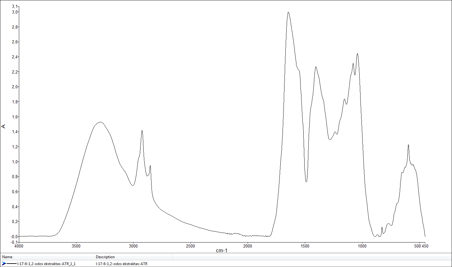 Mikrocheminiai ir instrumentiniai tyrimai: pH - 5,7; Geležies chlorido testas – teigiamas; Vanilino testas – teigiamas; Nitritinės rūgšties testas – neigiamas; Rodanino testas – neigiamas; Taninų klasė – kondensuoti taninai; ATR-FTIR spektroskopija – kondensuoti taninai.