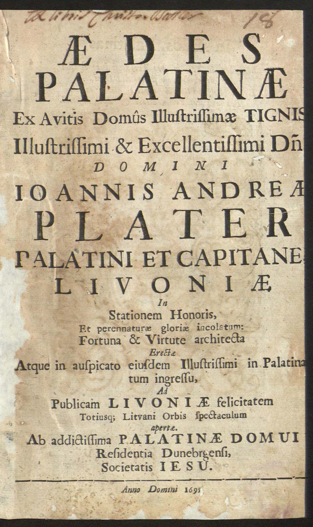 Įrišas knygos [Aedes palatinae ex avitis domus illustrissimae tignis illustrissimi et excellentissimi [...]. [Vilnae : typis Academicis S.I.], 1695.]