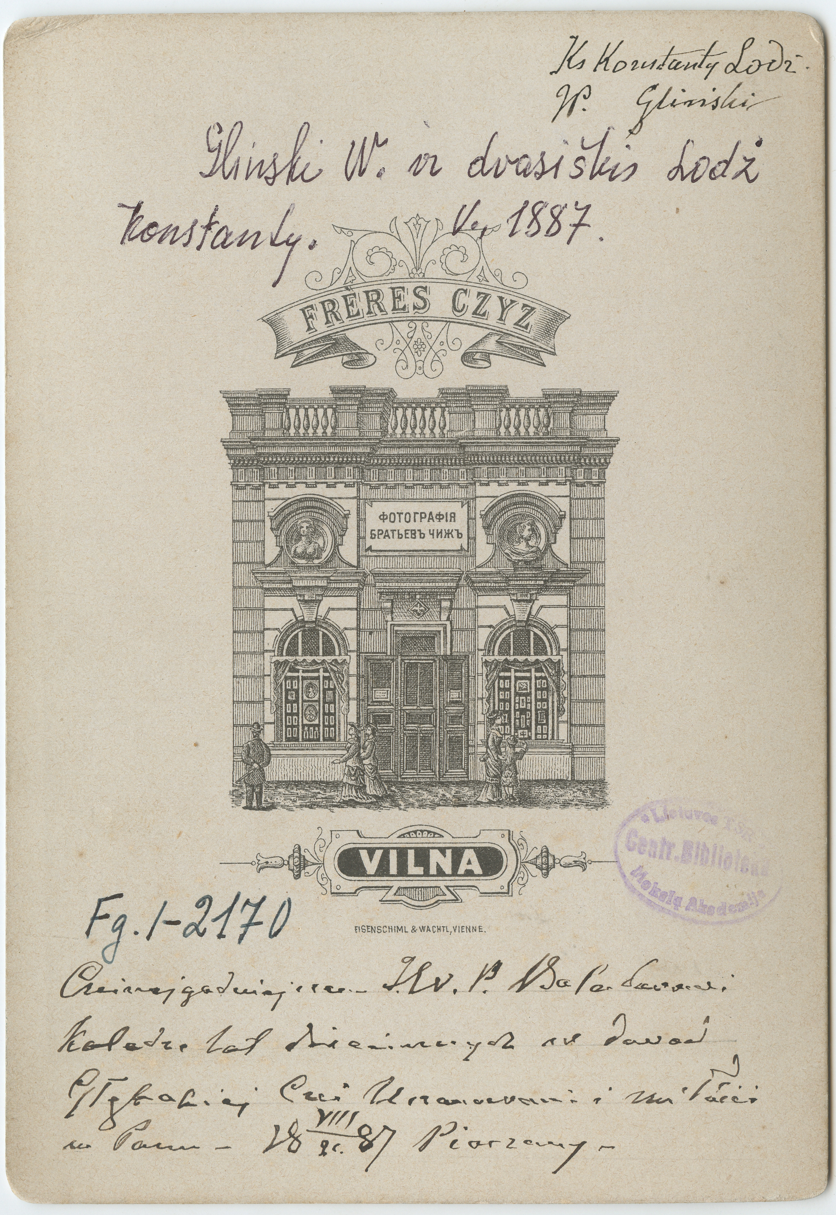 Kunigo Konstanty Lodż ir W. Gliński portretas / frères Czyż (Henryk, Edward, Wacław), Vilna : frères Czyż, [1887], 1 fotografija : tonuota ; 14 x 10.2 ; 16.4 x 11.2 cm.