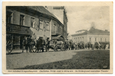Vom östlichen Kriegsschauplatz : Deutsches Militär rückt in Wilna ein. Im Hintergrund russisches Theater / Originalaufnahme vom Hofphotograph A.Kühlewindt, offizieller Kriegsphotograph, Königsberg i Pr. : Verlag Gebrüder Hochland, [1914-1916], 1 atvirukas ; 9.2 x 14 cm.