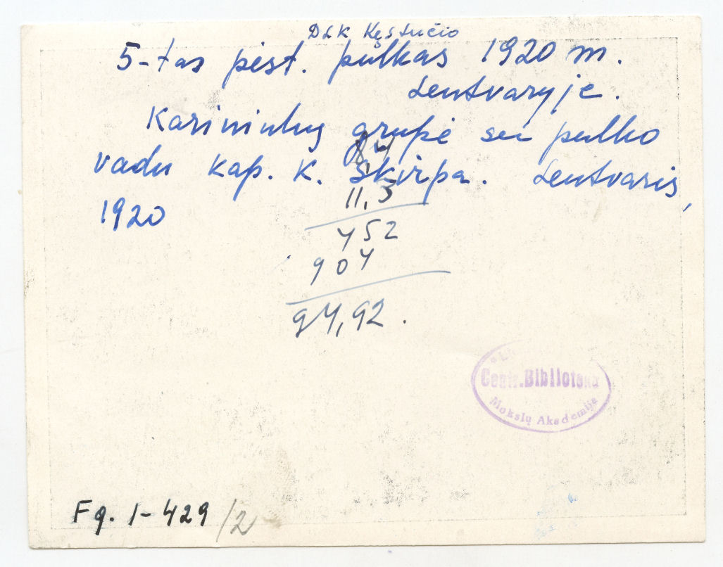 | dc.relation.isformatof | [Lietuvos kariuomenės 5-ojo pėstininkų pulko karininkų grupė su pulko vadu kapitonu K. Škirpa]. [Lentvaris] : [s.n.], [1920], 1 fotogr. | lt |