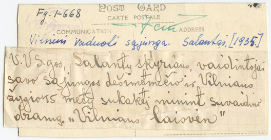 Vilniaus vadavimo sąjungos Salantų skyriaus aktorių grupė : [suvaidinusi spektaklį „Vilniaus laisvėn“], [Salantai] : [leidėjas nenustatytas], [1935], 1 fotografija : nespalvota ; 6.6 x 12.4 cm.