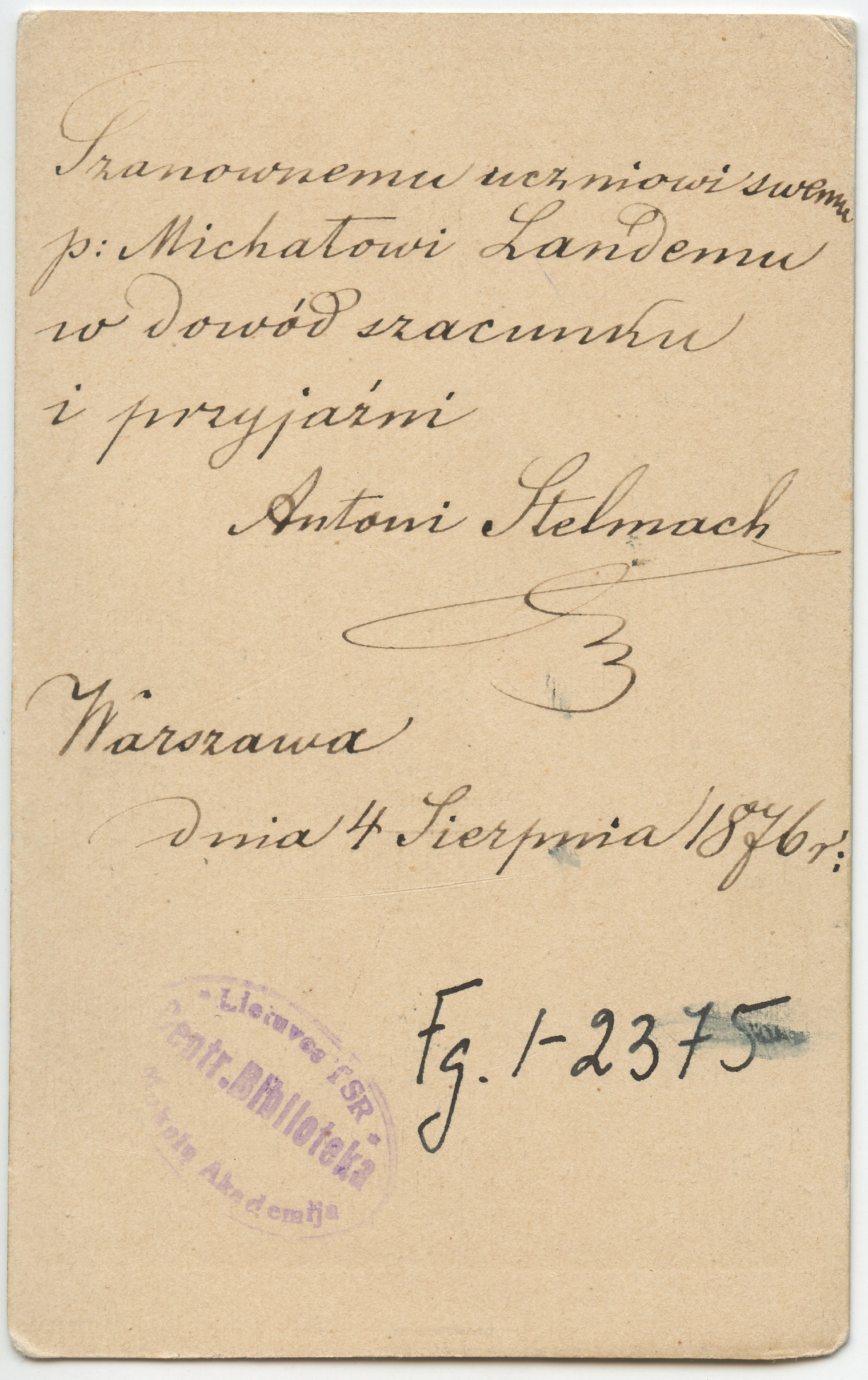 Antoni Stelmach : [portretas], [Warszawa] : [leidėjas nenustatytas], [1876], 1 fotografija : nespalvota ; 9 x 5,7 ; 10 x 6.3 cm.
