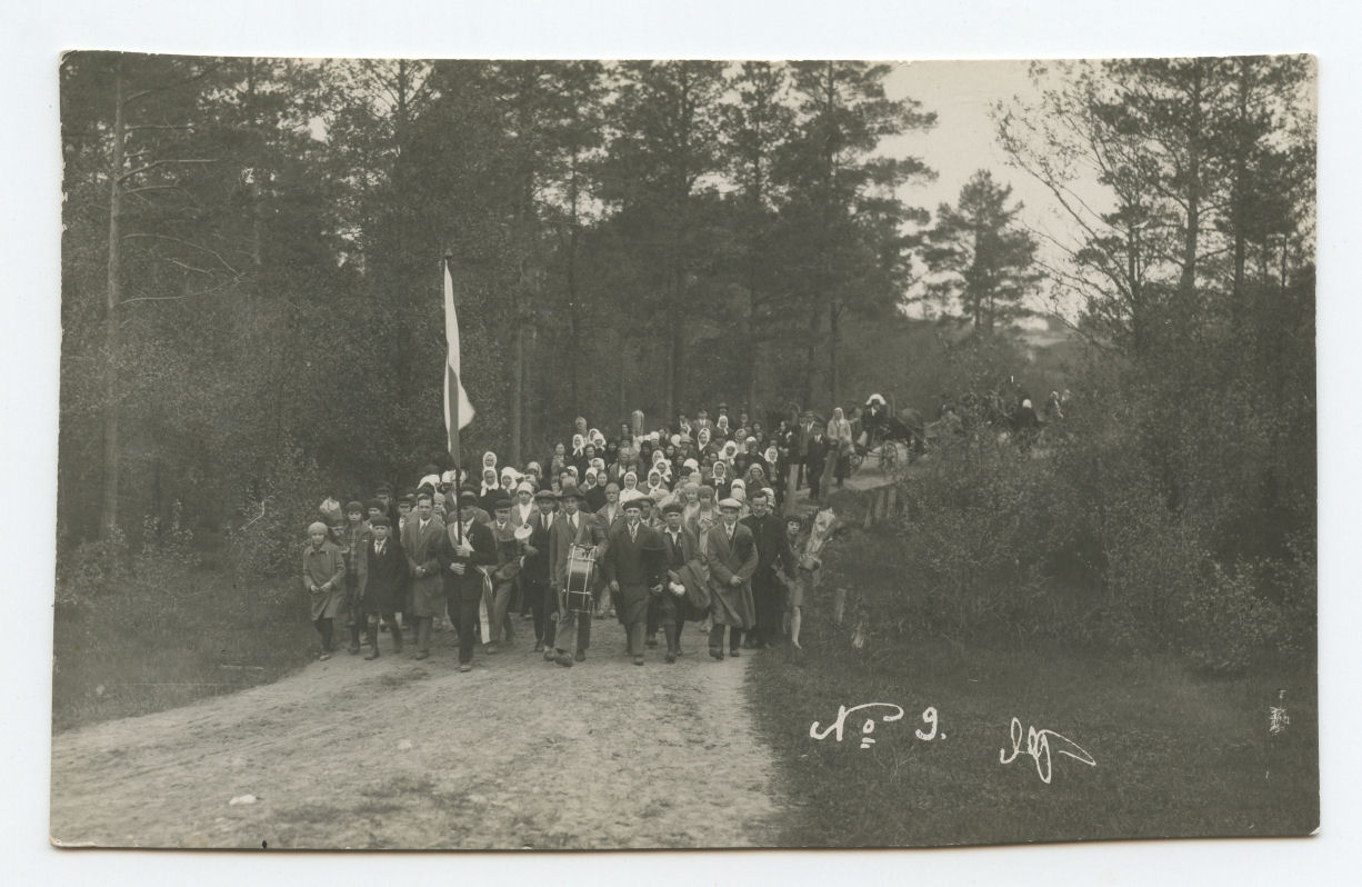 [Šventinė eisena su vėliava ir orkestru gamtoje], foto M. Tomaļunas. [Rīgā] : [M. Tamaļunas], [1928-1940], 1 fotogr.