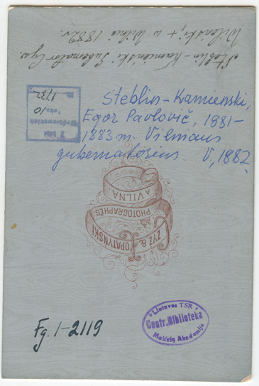 Steblin-Kameński : [gubernator cywilny Wileński : portretas] / Czyż & Łopatyński, À Vilna : photographes Czyż & Łopatyński, [1875-1879], 1 fotografija : ovali, tonuota ; 10.8 x 7.4 ; 13.4 x 8.9 cm.