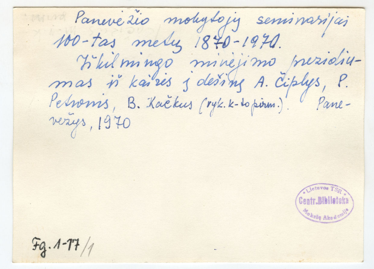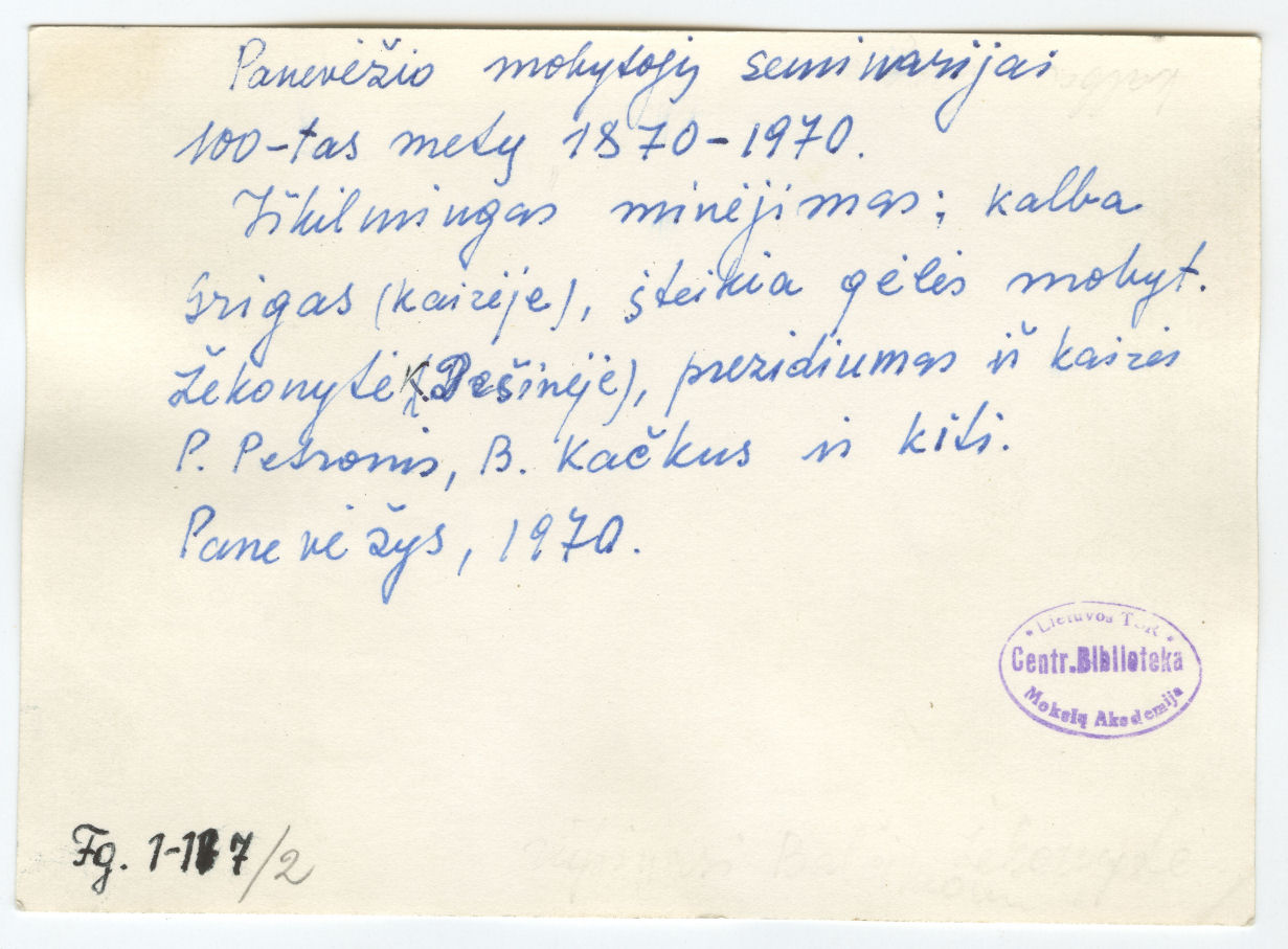 [Panevėžio mokytojų seminarijos įkūrimo 100-ųjų metinių minėjimas]. [Panevėžys] : [s.n.], [1970], 2 fotogr.