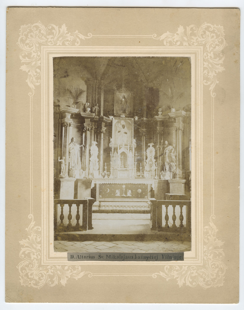 Didysis altorius Šv. Mikalojaus bažnyčioj Vilniuje / [A. Jurašaitis], [Vilnius] , [1905-1915], 1 fotogr. ; 17x11,9 ; 25,5x20,2 cm.
