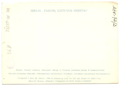 Šiauliai - 750 m. : "Šiaulių" viešbutis, "Motinystė" (sklupt. A. Toleikis), "Nykštukai" (skulpt. B. Kasparavičienė) / fotogr. J. Polis, Vilnius : Mintis, 1986, 1 spalvotas atvirukas ; 10.5 x 14.7 cm.