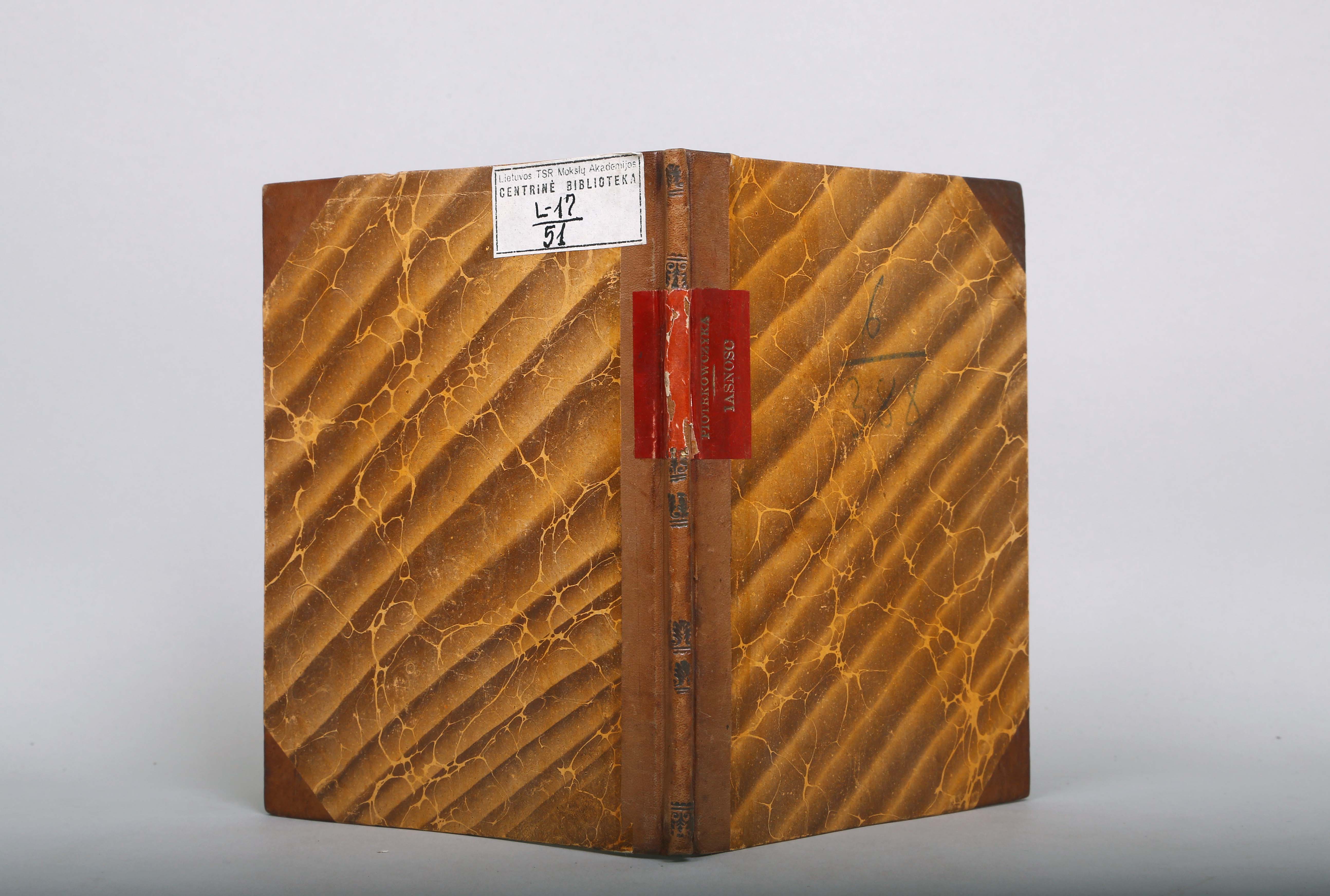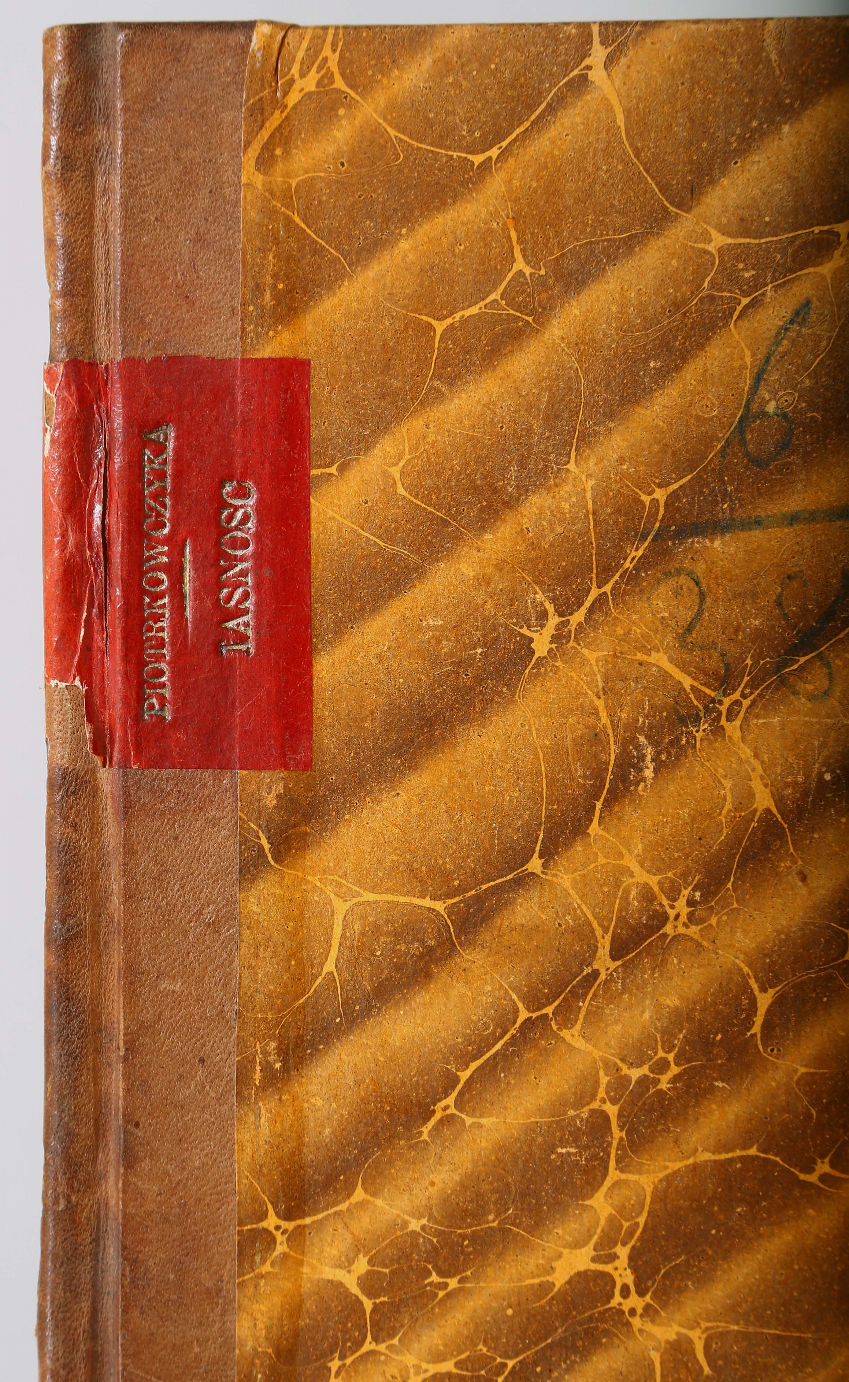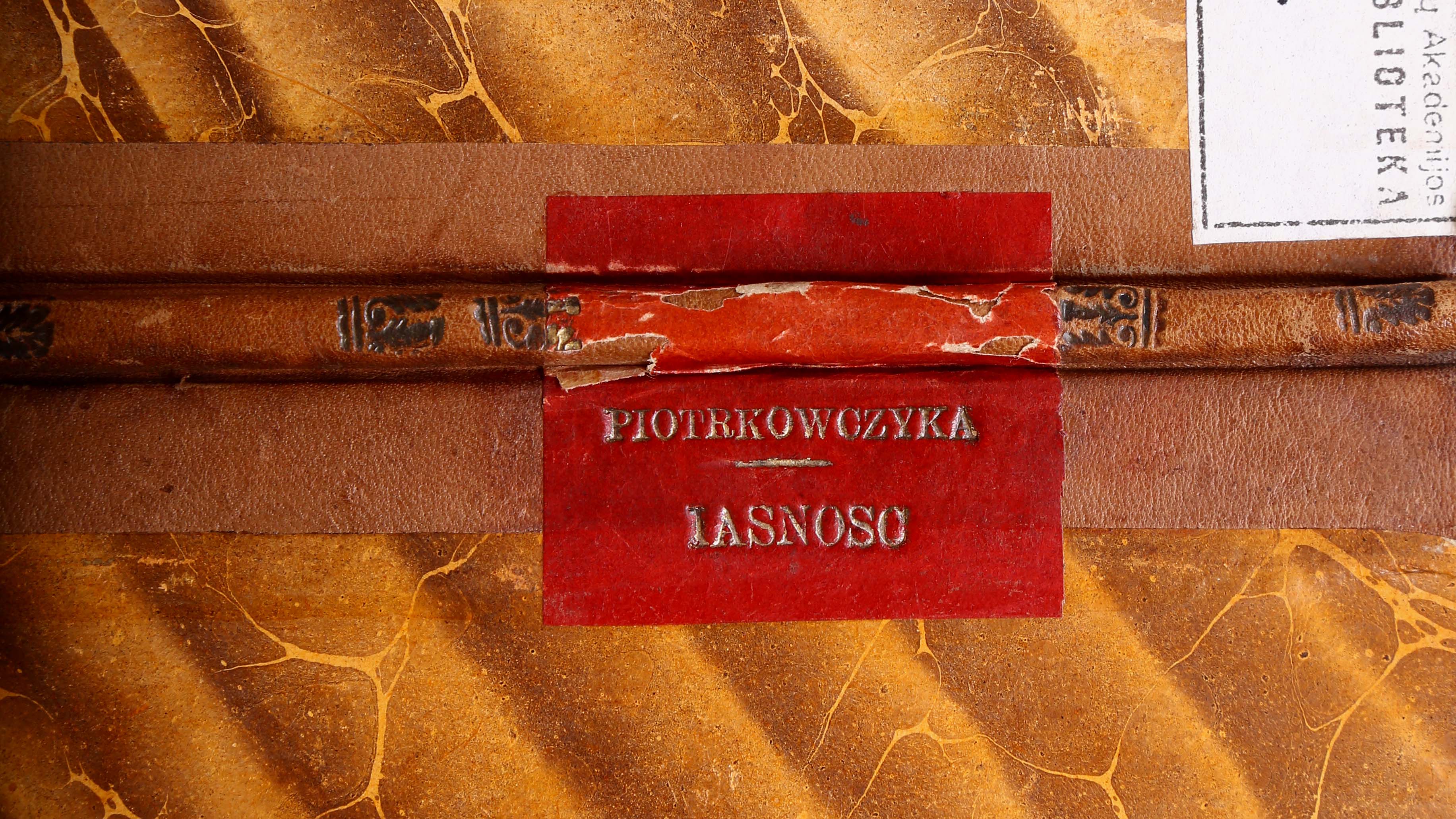 Įrišas knygos [Piotrkowczyk, Aleksy. Iasnosc ... Theodory Krystyny hrabianki z Tarnowa Sapiezyny W.X.L. [...]. Vilnae [Vilnius] : typis Academ. Societ. Iesu, 1653.]