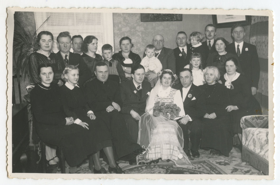 [Jaunavedžiai su vestuvių puotos dalyviais]. [S.l.] : [s.n.], [193-?], 1 fotogr.