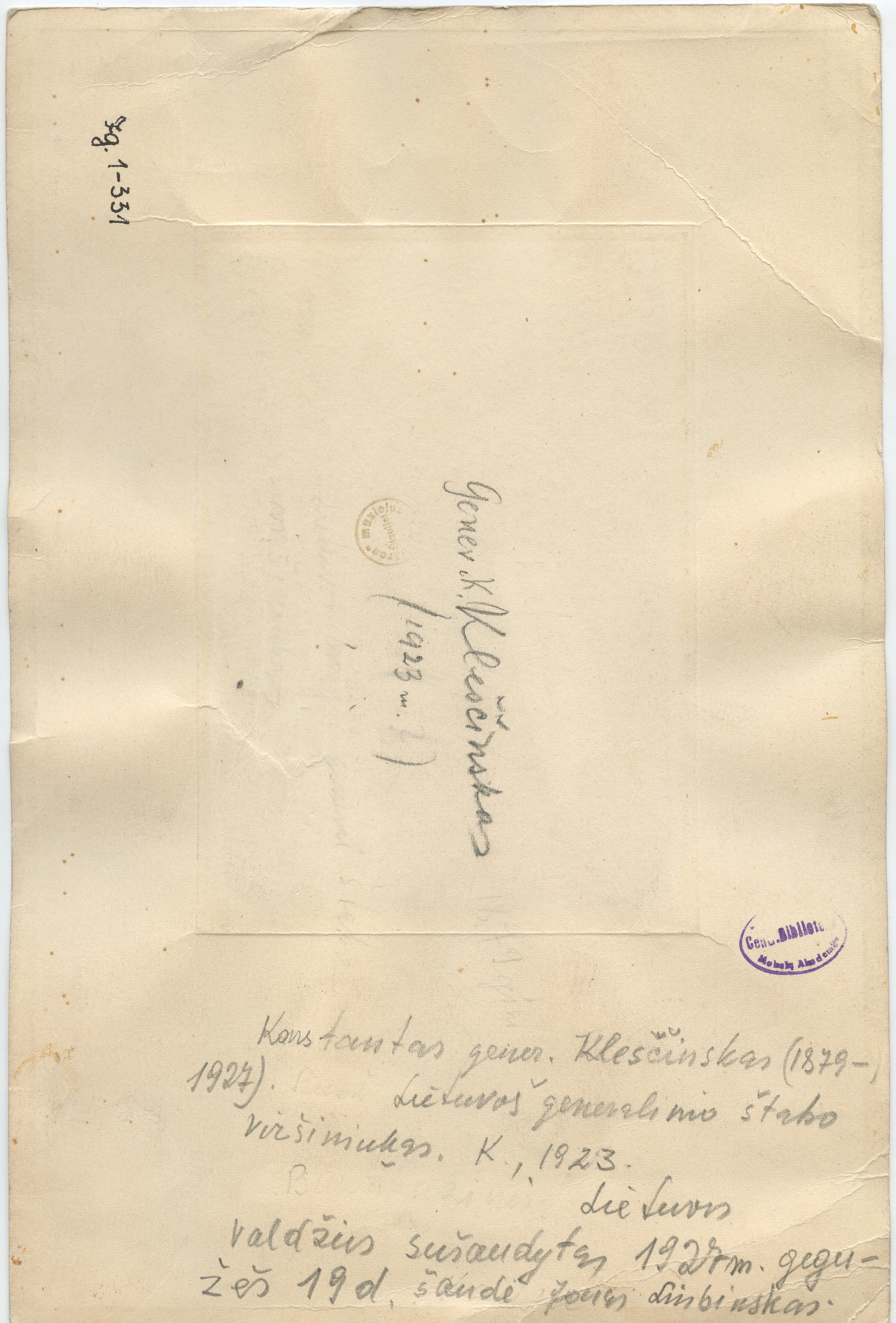 Lietuvos kariuomenės Generolas leitenantas Konstantinas Kleščinskis : [portretas] / E.K.B. Fotografija, Kaunas : E.K.B. foto atelje, 1922-1923, 1 fotografija : nespalvota ; 14.8 x 10.2 ; 29.3 x 19.3 cm.