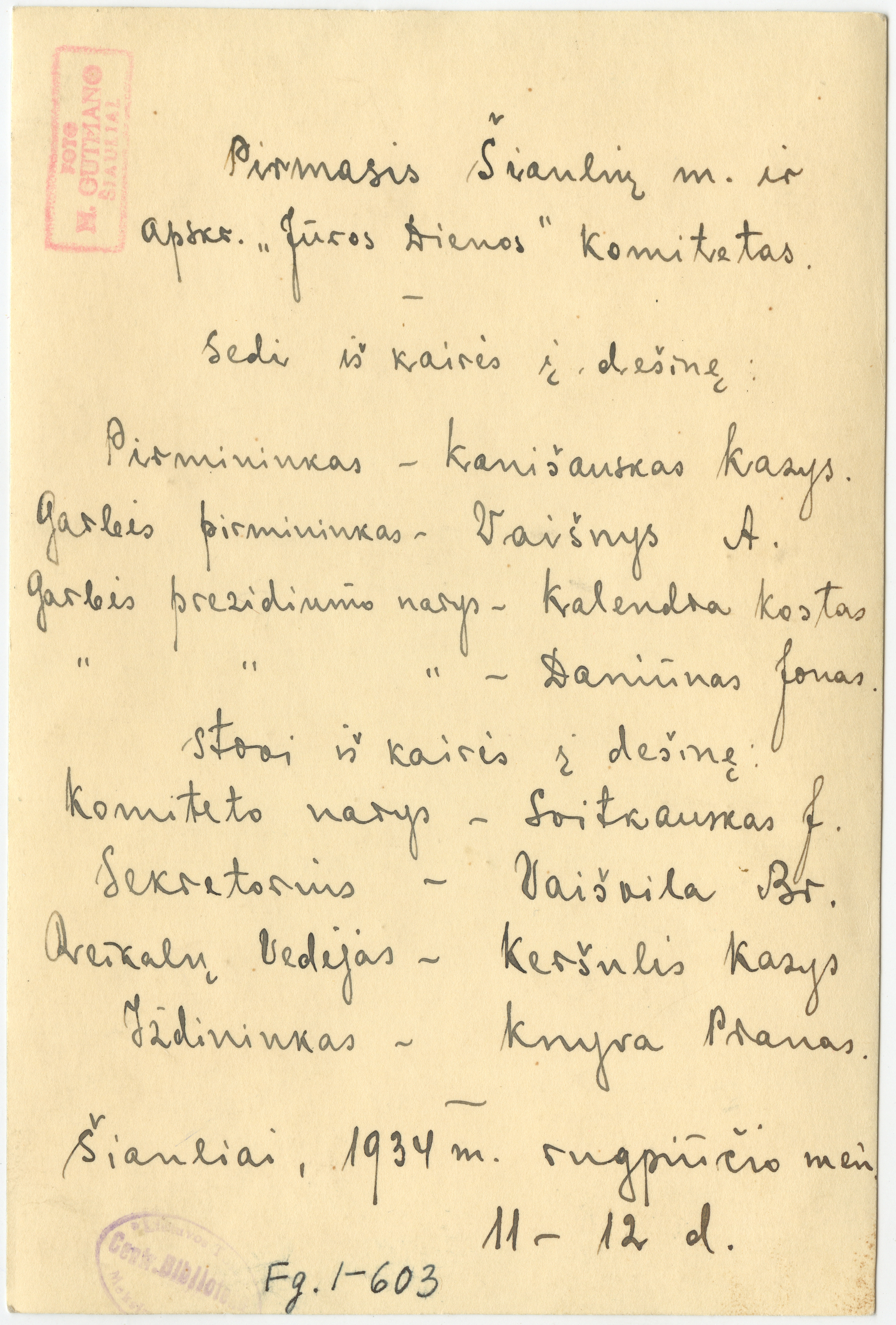 Pirmasis Šiaulių miesto ir apskrities "Jūros Dienos" Komitetas / foto M.Gutmano, Šiauliai : [foto M.Gutmano], 1934, 1 fotografija : nespalvota ; 15.7 x 17.5 cm.